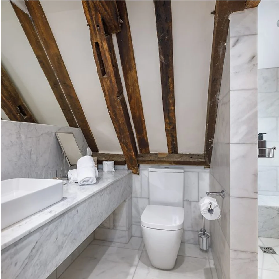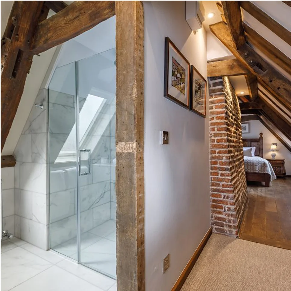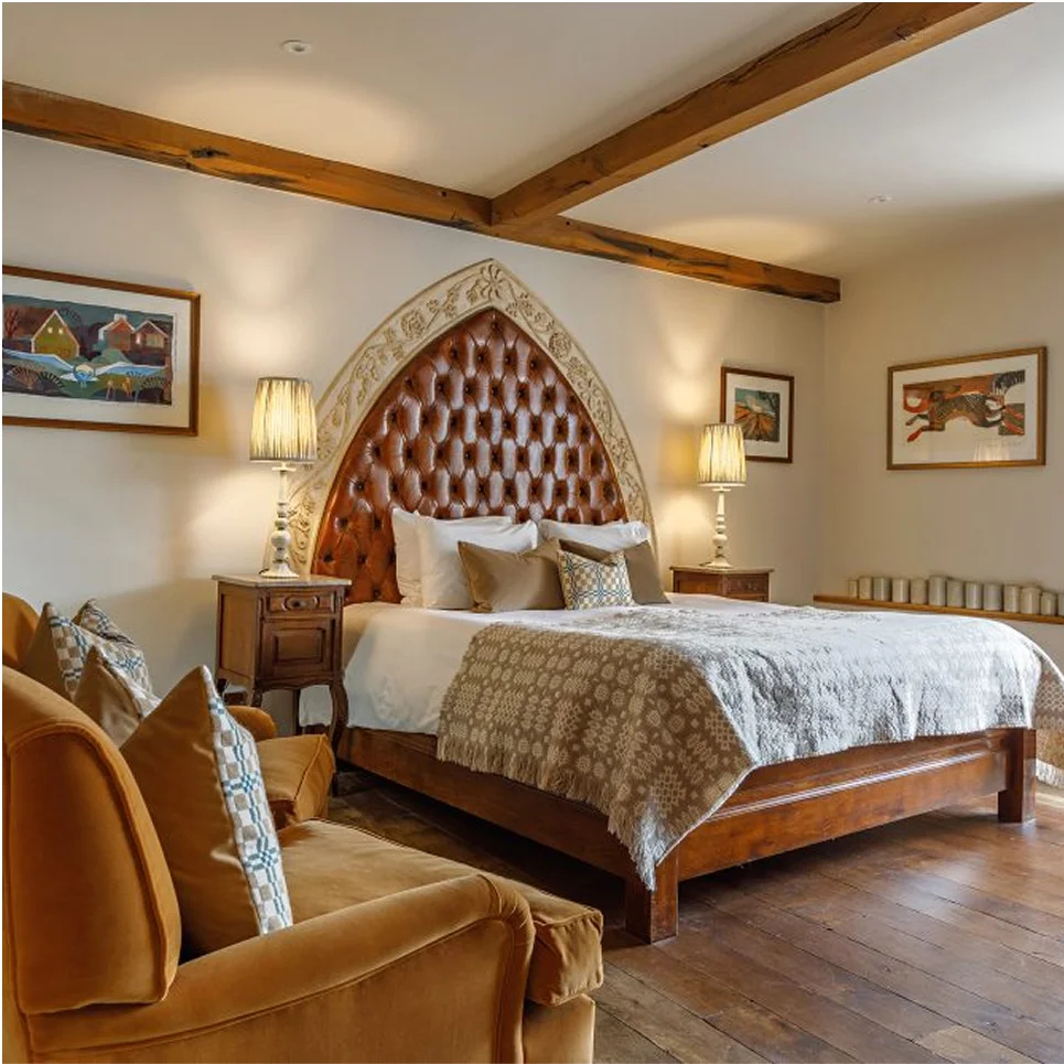 Perched in the top-floor eaves of Byfords, Room 5 has been beautifully refreshed as part of the refurbishment. An extended dormer floods the space with natural light, while the redesigned bathroom now features a striking walk-in shower with Carrara marble tiles. Original beams and exposed brickwork remain, now paired with thoughtful updates for added comfort, like a plush armchair and a luxurious five-foot Vispring bed.