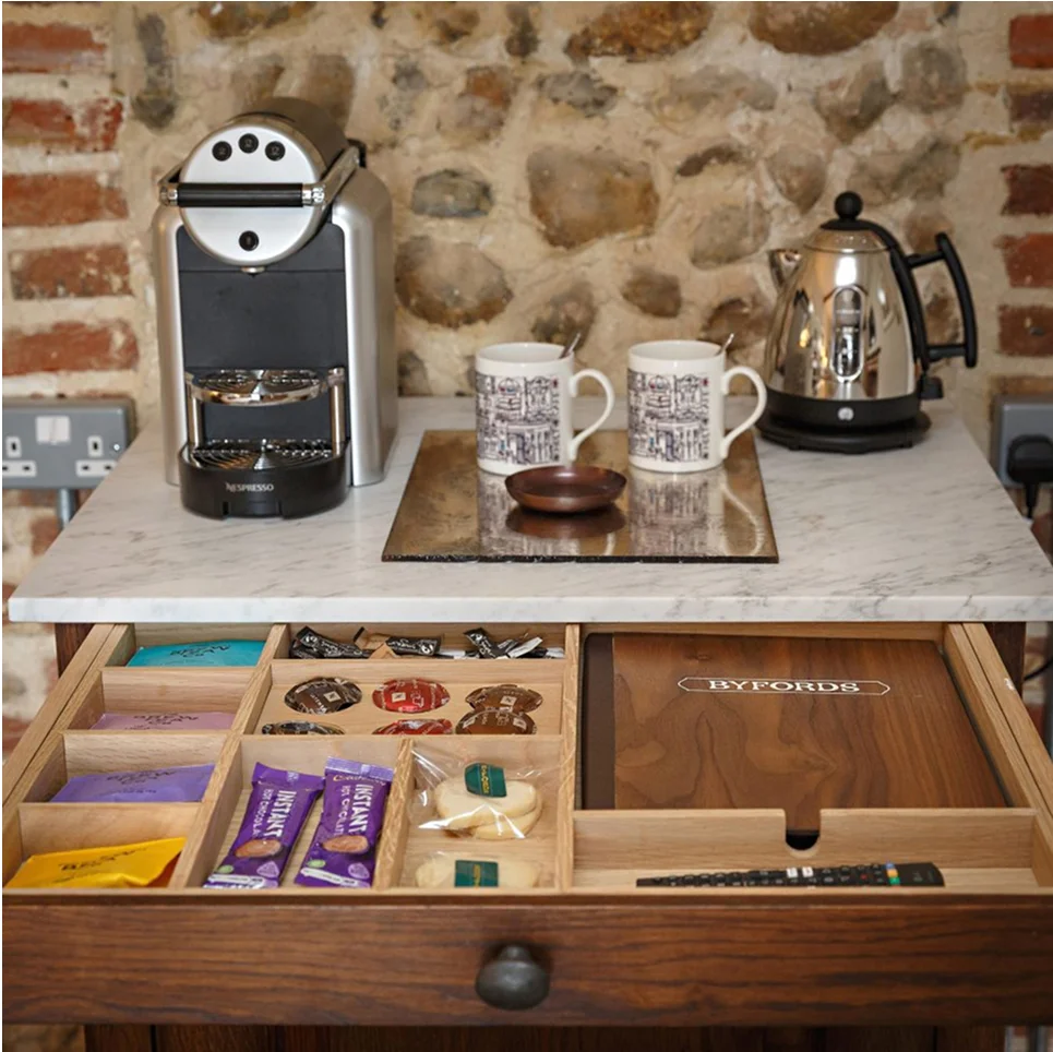 Fully stocked for your comfort. the new room larders come with Nespresso coffee, hot chocolate, a selection of teas, sweet treats, and fresh milk in the fridge - everything you need for a cosy stay. You’ll also find a handy welcome folder with all the essential info to help you settle in and enjoy your visit.