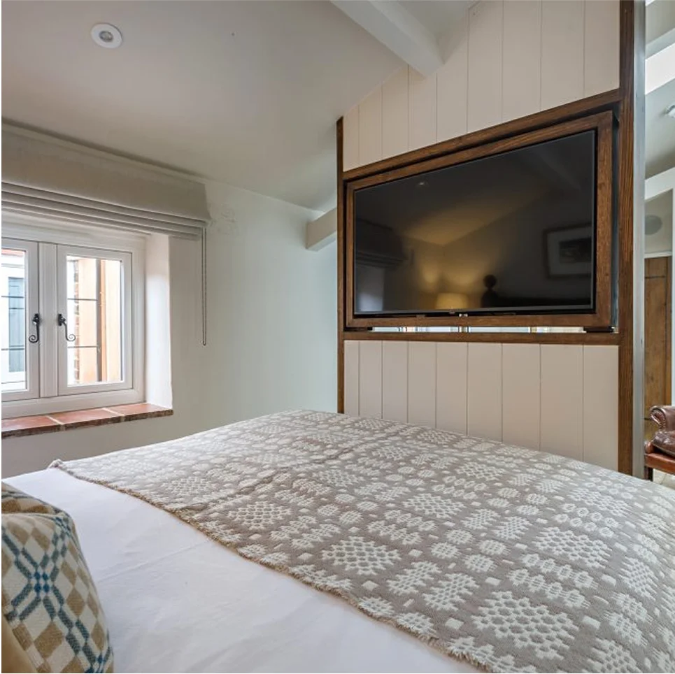 Tucked away on the first floor, Room 4 has had a full makeover: new windows, a gleaming new bathroom, and special touches that make it feel like your own private retreat. A standout feature of the redesign is a custom-built wall panel showcasing a cleverly designed revolving TV. Whether you're lounging in bed or relaxing in the seating area, you can enjoy your favourite shows in total comfort.