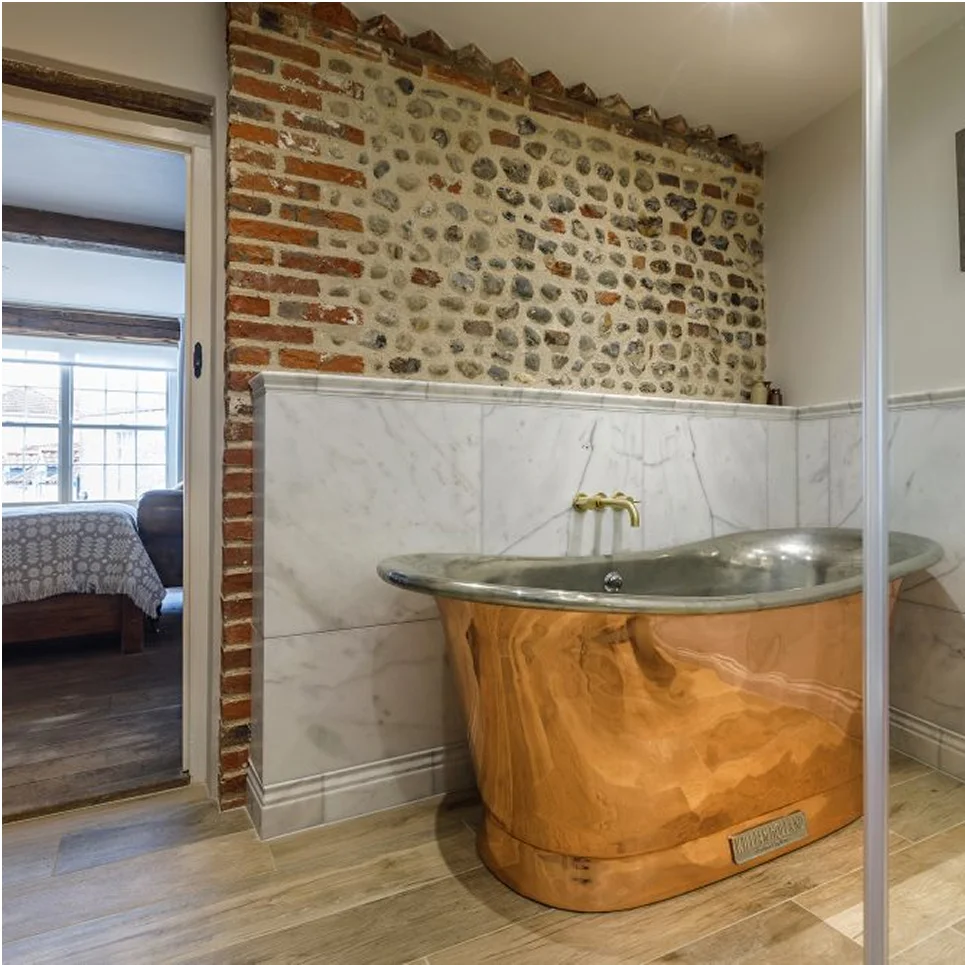 Room 1 remains one of Byfords' grandest rooms, combining timeless charm with the comfort and elegance of Byfords’ new signature style. A standout feature of the redesign is the striking freestanding William Holland copper bathtub, set within a truly spectacular bathroom adorned with luxurious Carrara marble tiles and characterful exposed brick and flint.
