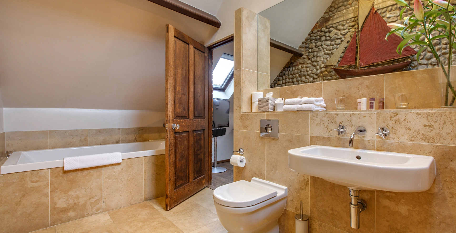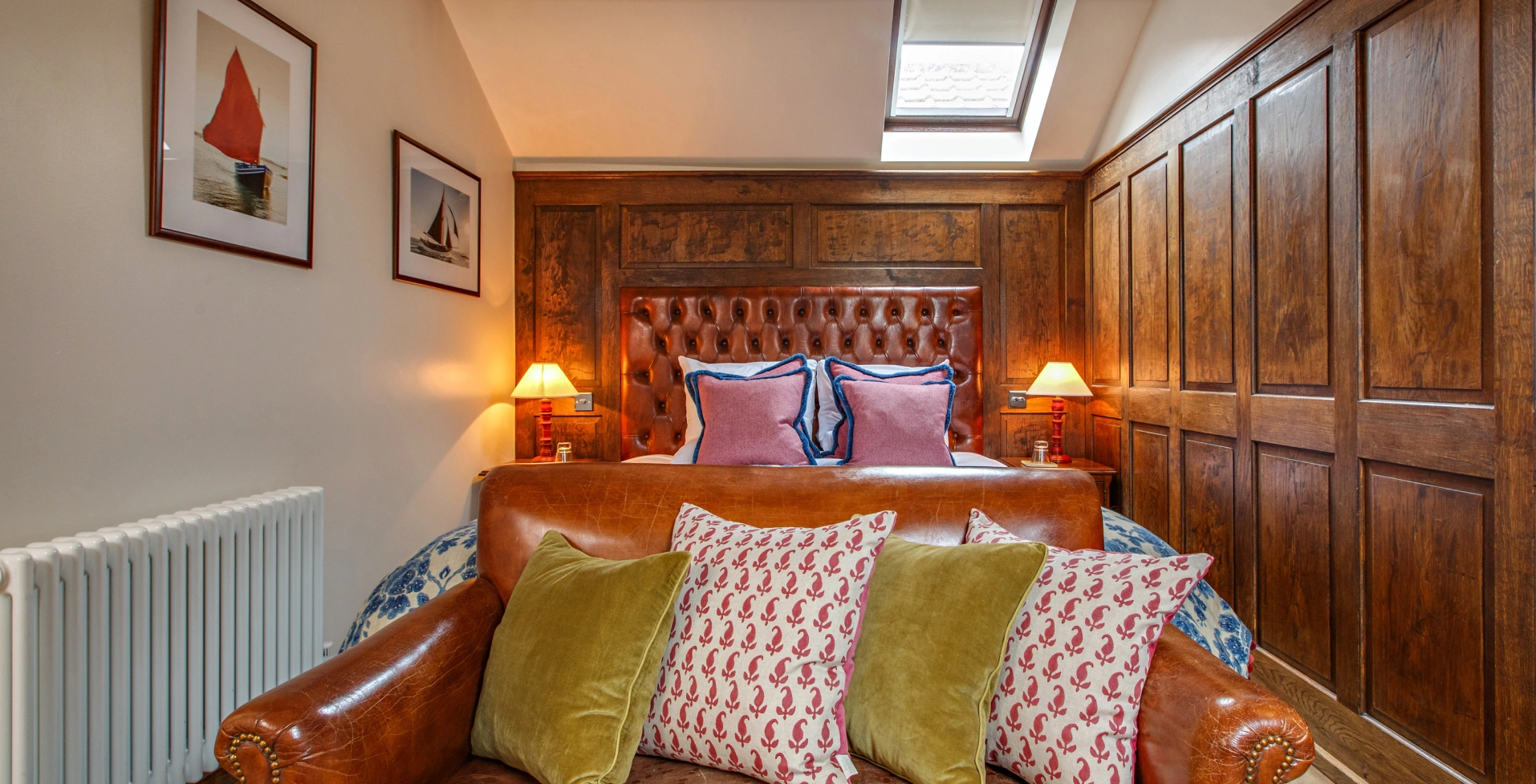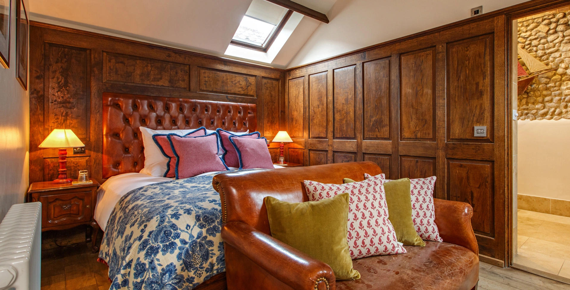 Room 15 is one of Byfords’ most luxurious Posh B&B rooms - beautifully panelled, warmly lit, and full of thoughtful details. A stunning chandelier hangs above the bed, casting a soft glow over the boat-themed décor, bringing subtle coastal charm to the space. The en-suite bathroom is just as special, with original cobbled walls, a double-ended bath, a large walk-in drench shower and twin sinks, perfect for a proper pamper session.