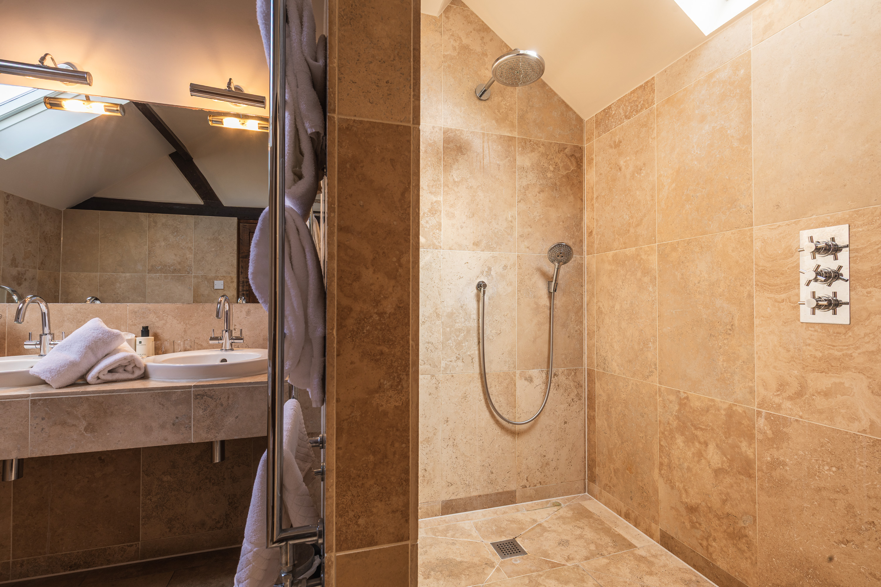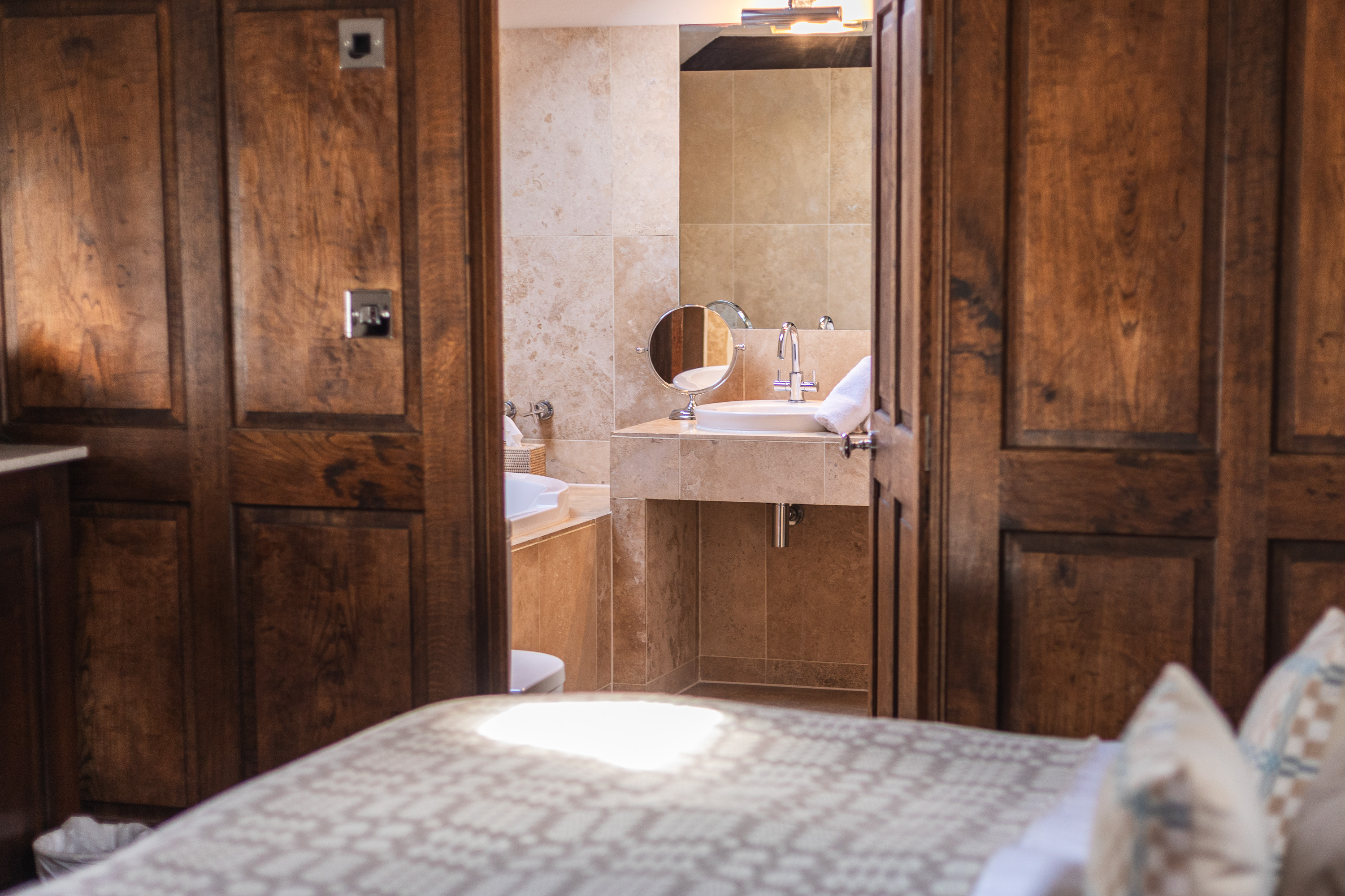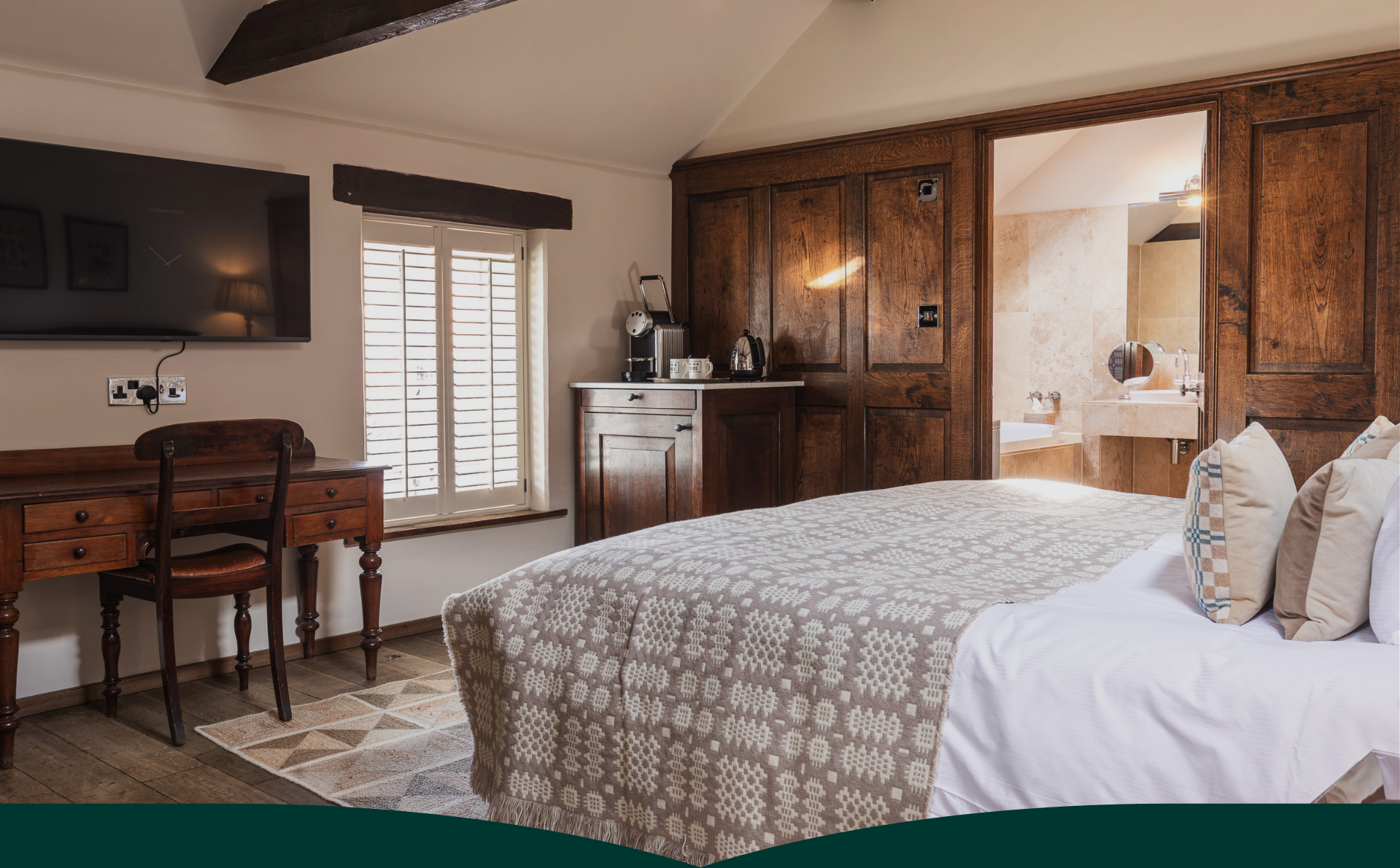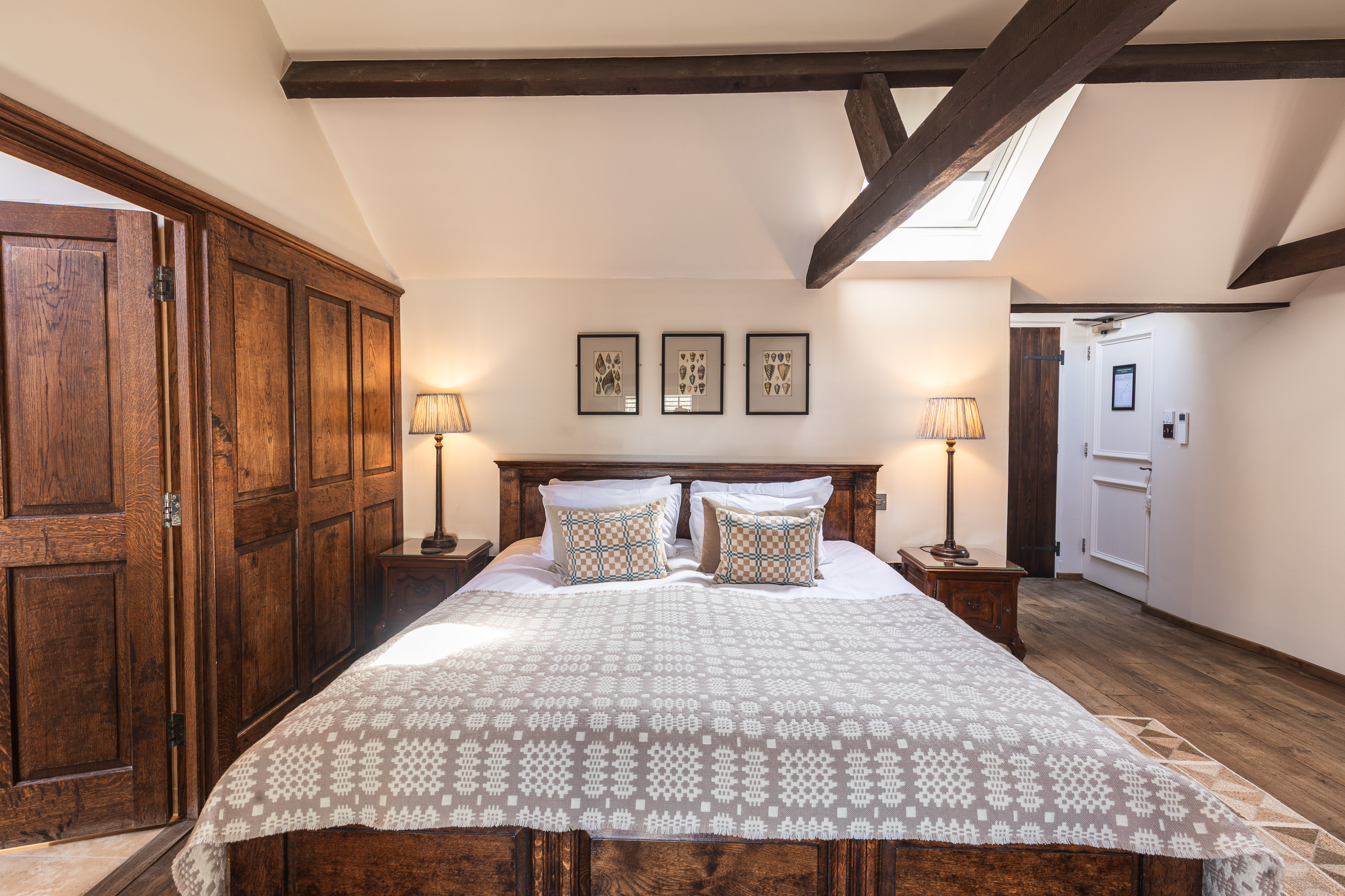 Room 16 is a spacious room with a healthy dose of Byfords quirk. Two chandeliers and matching table lamps add a touch of grandeur, while playful details and coastal touches keep things stylish and relaxed. The en-suite is one of our largest, featuring a double-ended bath, a walk-in drench shower, and twin sinks for leisurely mornings. Add crisp Egyptian cotton linen, a luxurious Vispring bed, and an entertainment system with bathroom speaker, and you’ve got a space made for the perfect stay.