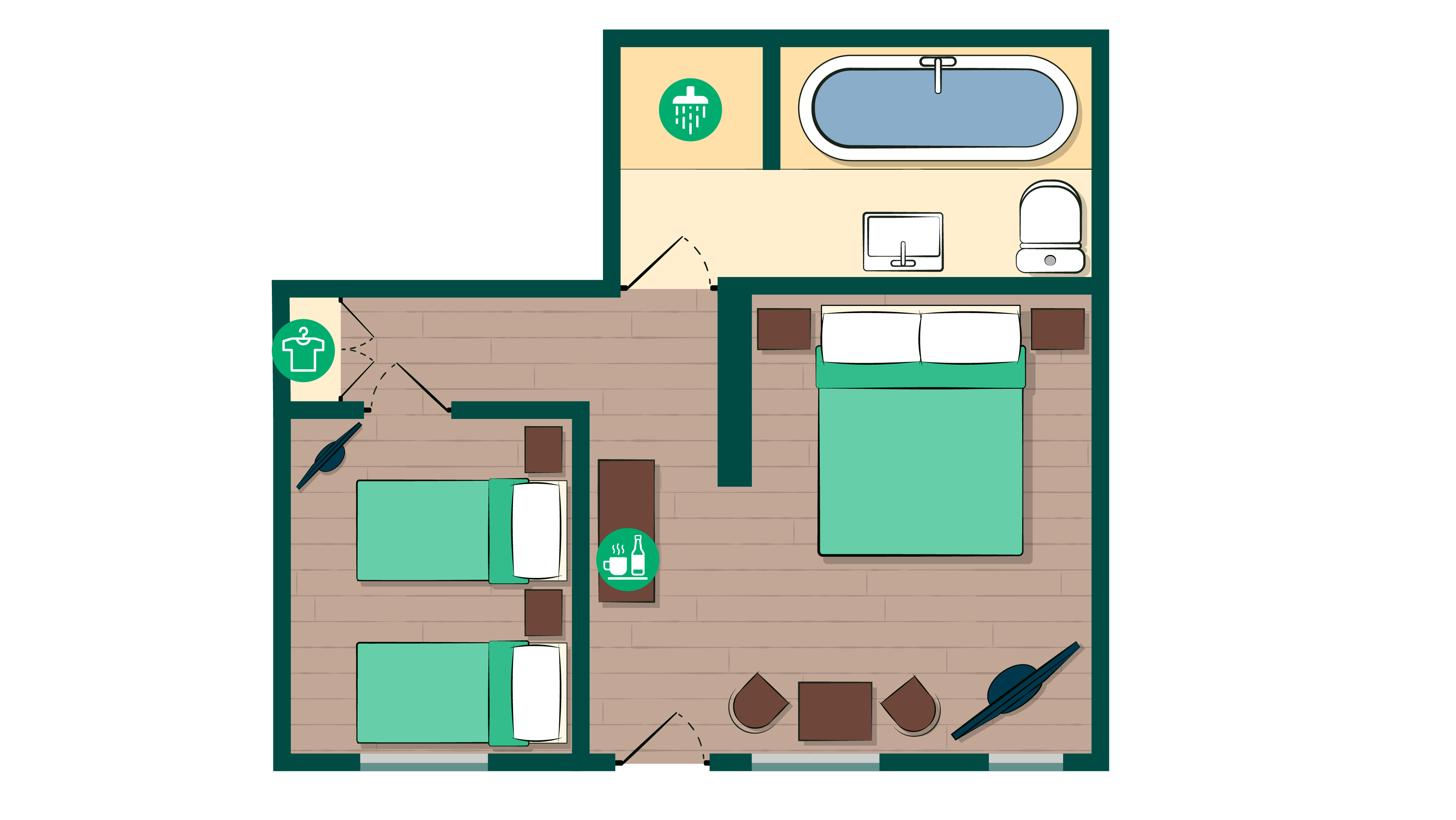 Tucked away on the ground floor, Room 17 is a warm, intimate space perfect for a cosy couple's escape or trip with the kids. In the master bedroom, a six-foot Vispring bed, dressed in crisp Egyptian cotton, invites long lie-ins, while comfy armchairs and a Nespresso coffee at arm’s reach make lazy mornings even sweeter. The second bedroom hosts two comfortable single beds, and the bathroom is a true highlight: with a luxurious drench shower and dual-bathing tub perfect for unwinding after a day exploring Norfolk.