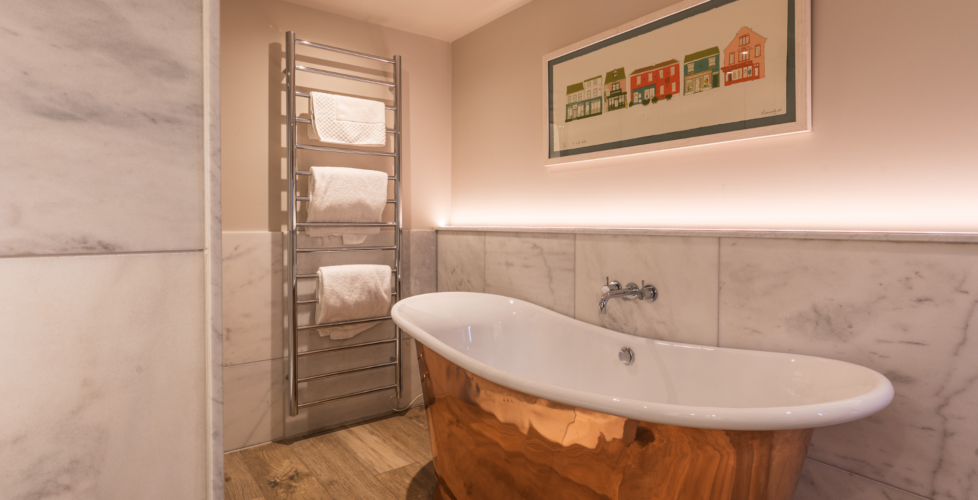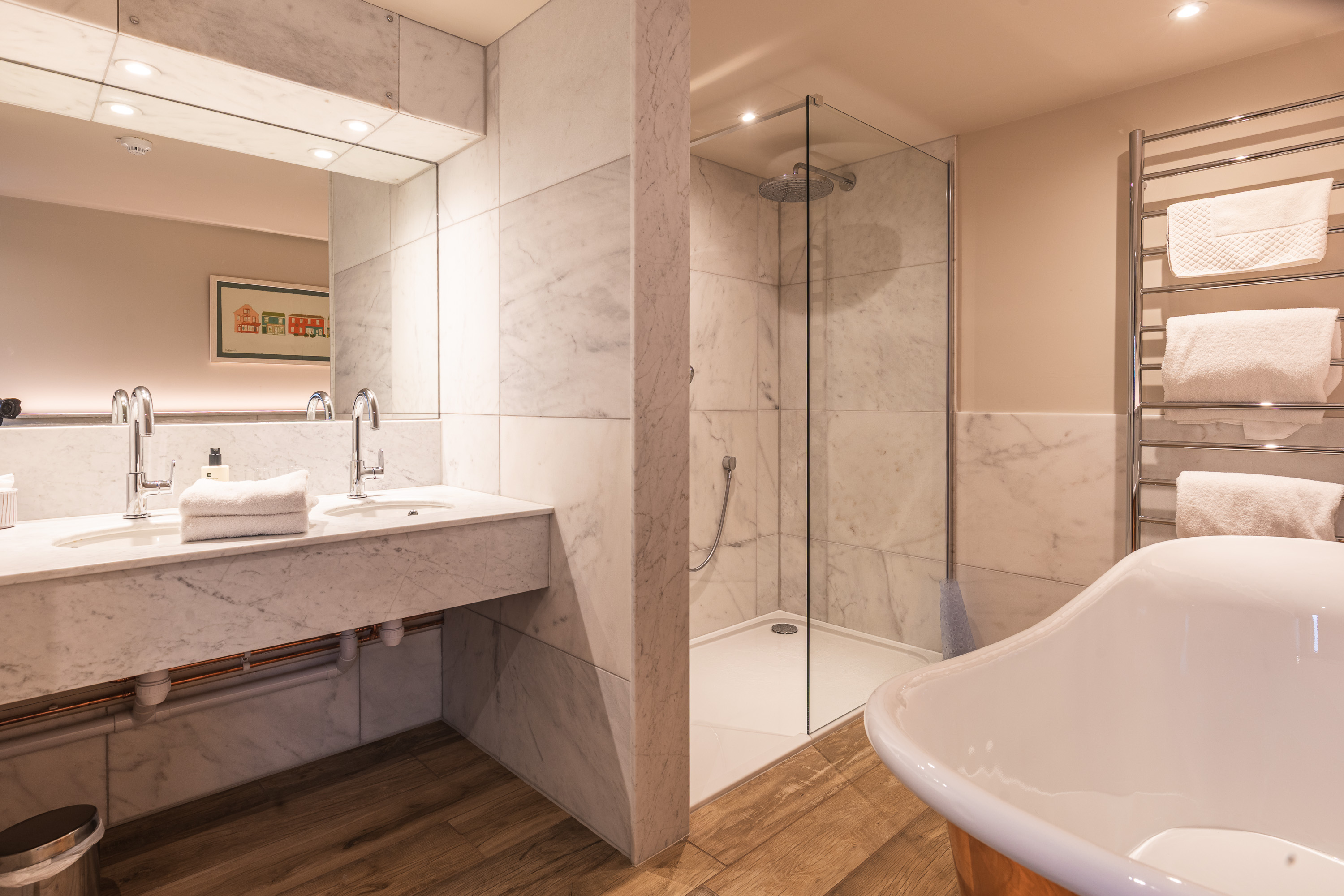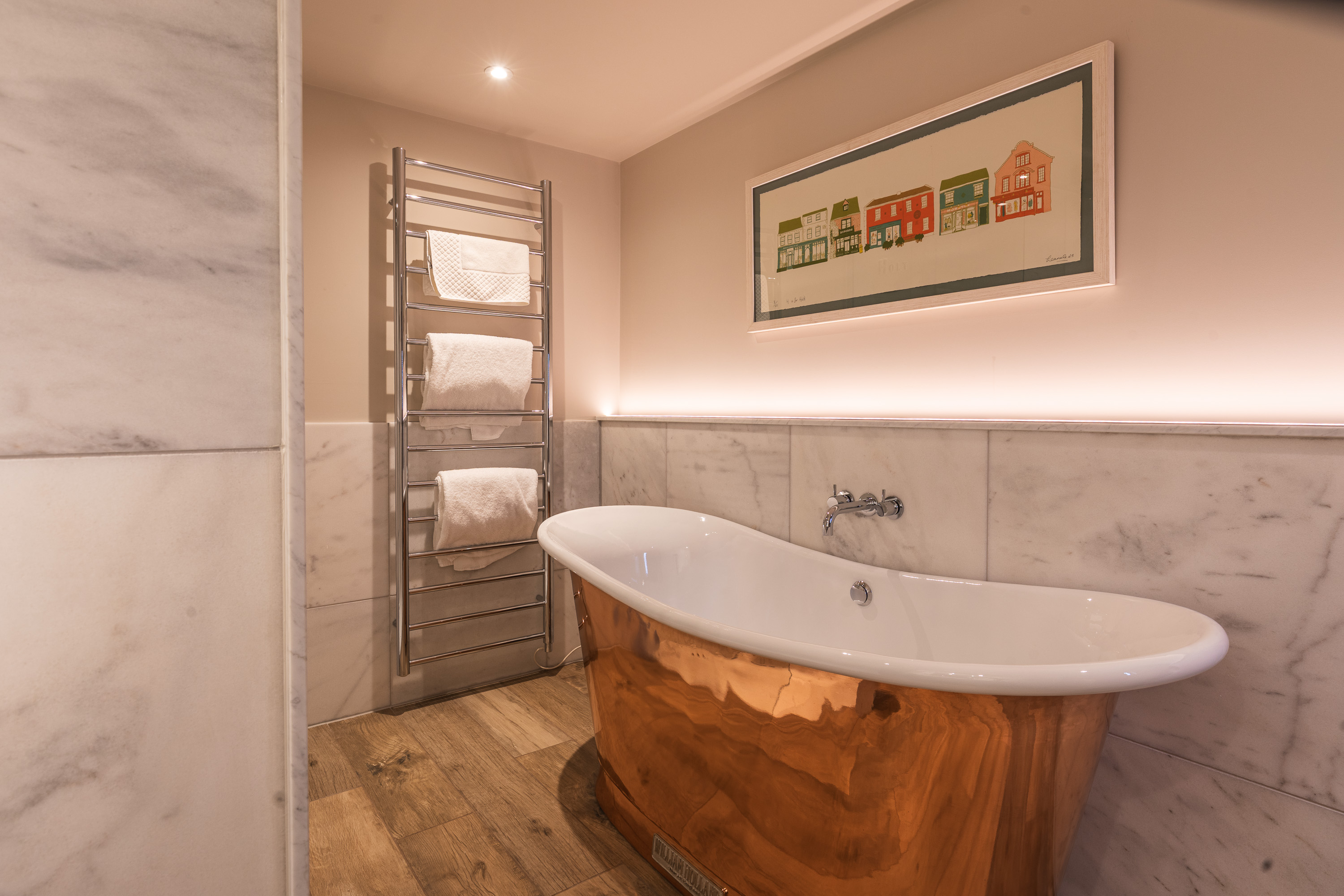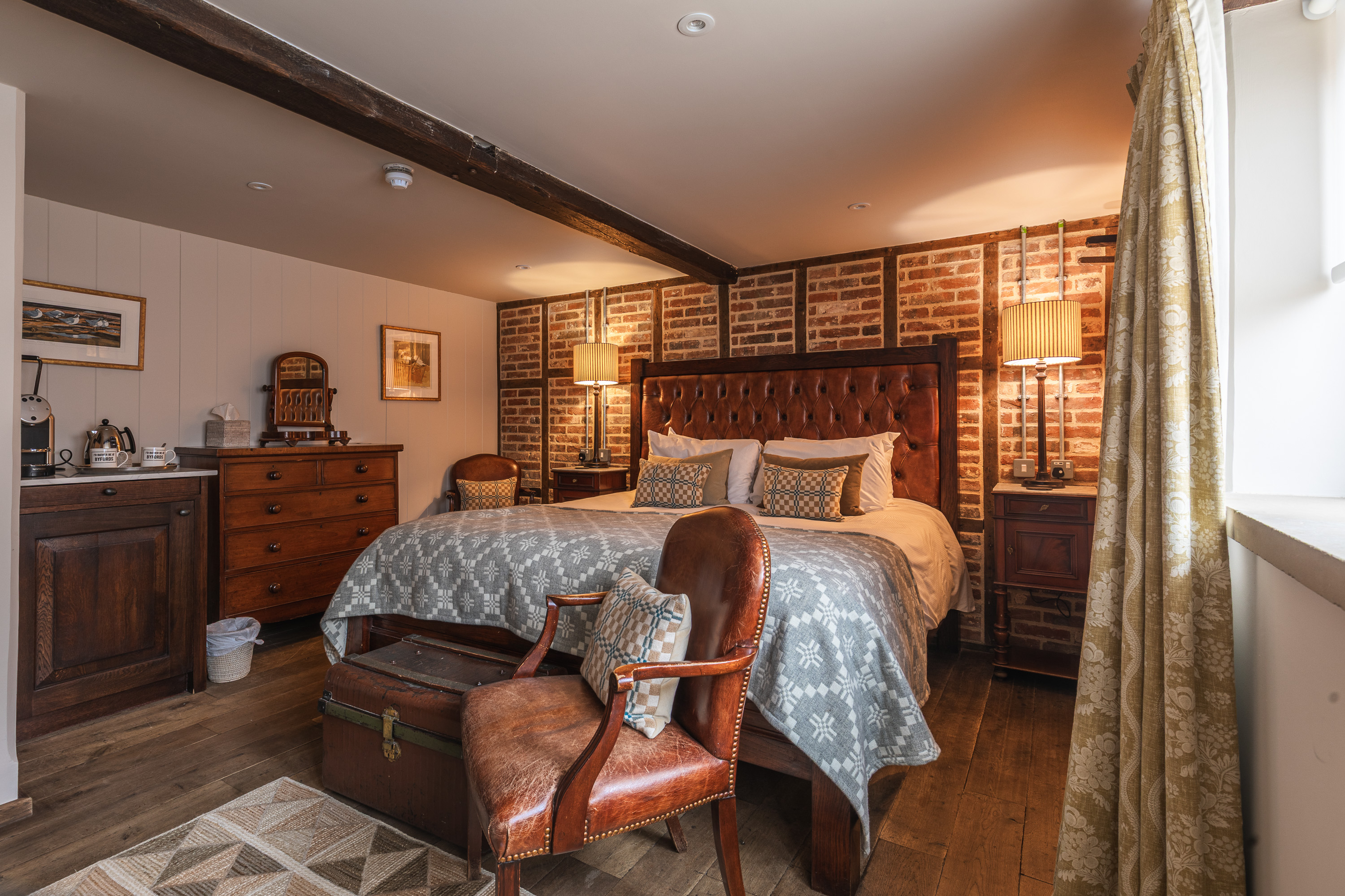 Tucked away on the ground floor, Room 17 is a warm, intimate space perfect for a cosy couple's escape. In the bedroom, a six-foot Vispring bed, dressed in crisp Egyptian cotton, invites long lie-ins, while comfy armchairs and a Nespresso coffee at arm’s reach make lazy mornings even sweeter. The large bathroom is a true highlight: with a luxurious drench shower, an impressive free-standing copper bathtub, and twin sinks, it's perfect for unwinding after a day exploring Norfolk.