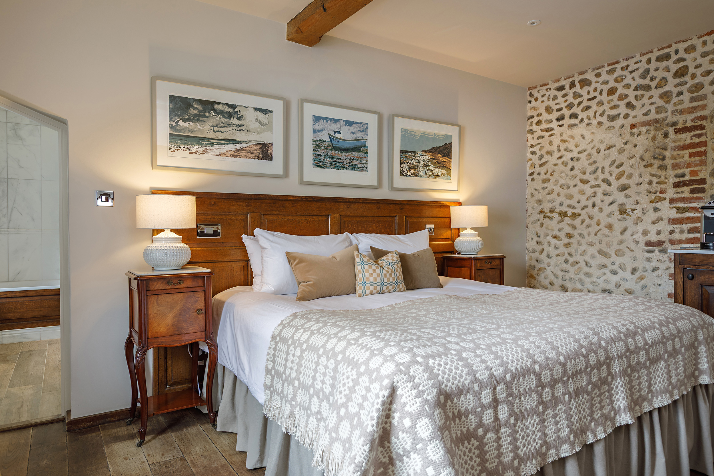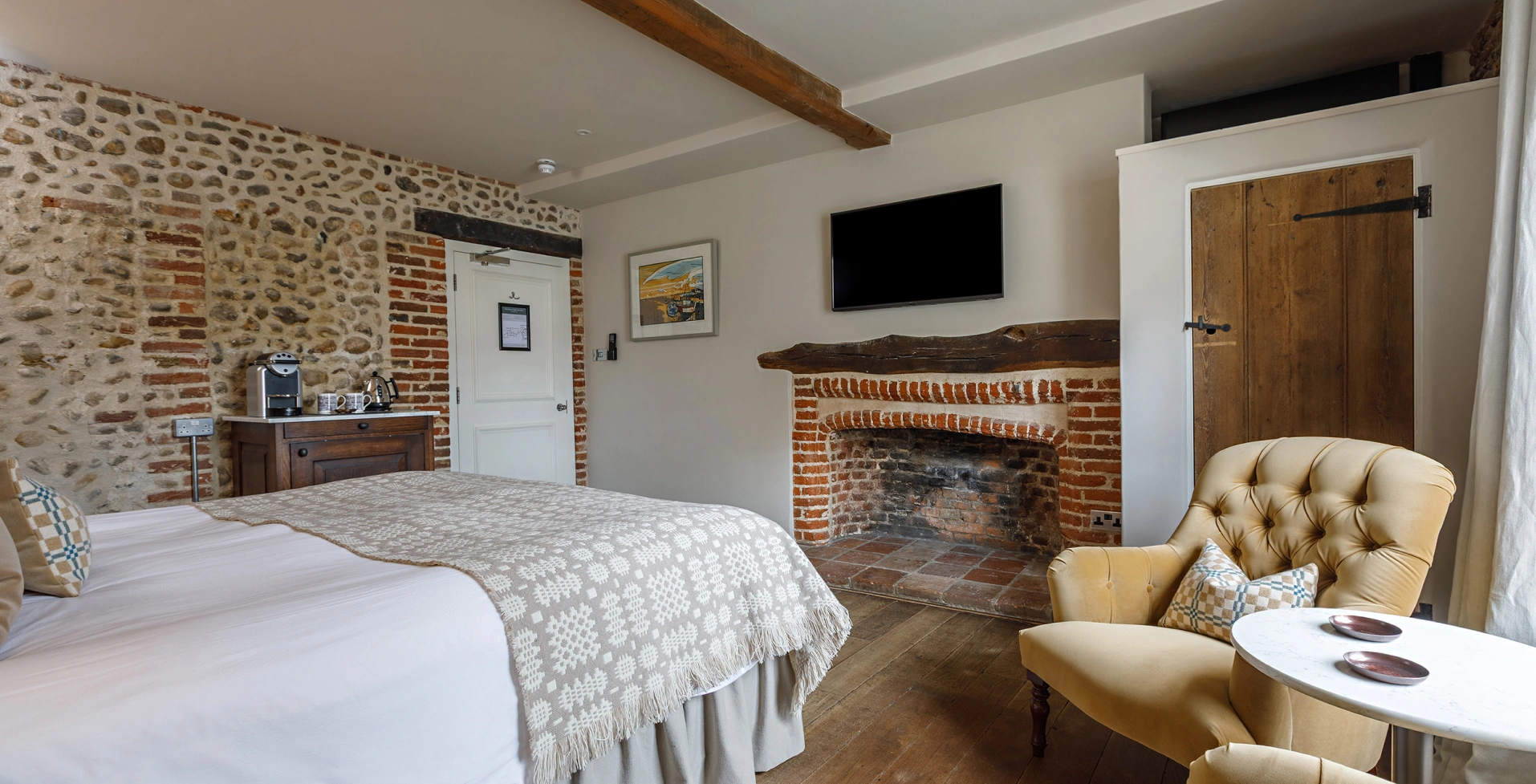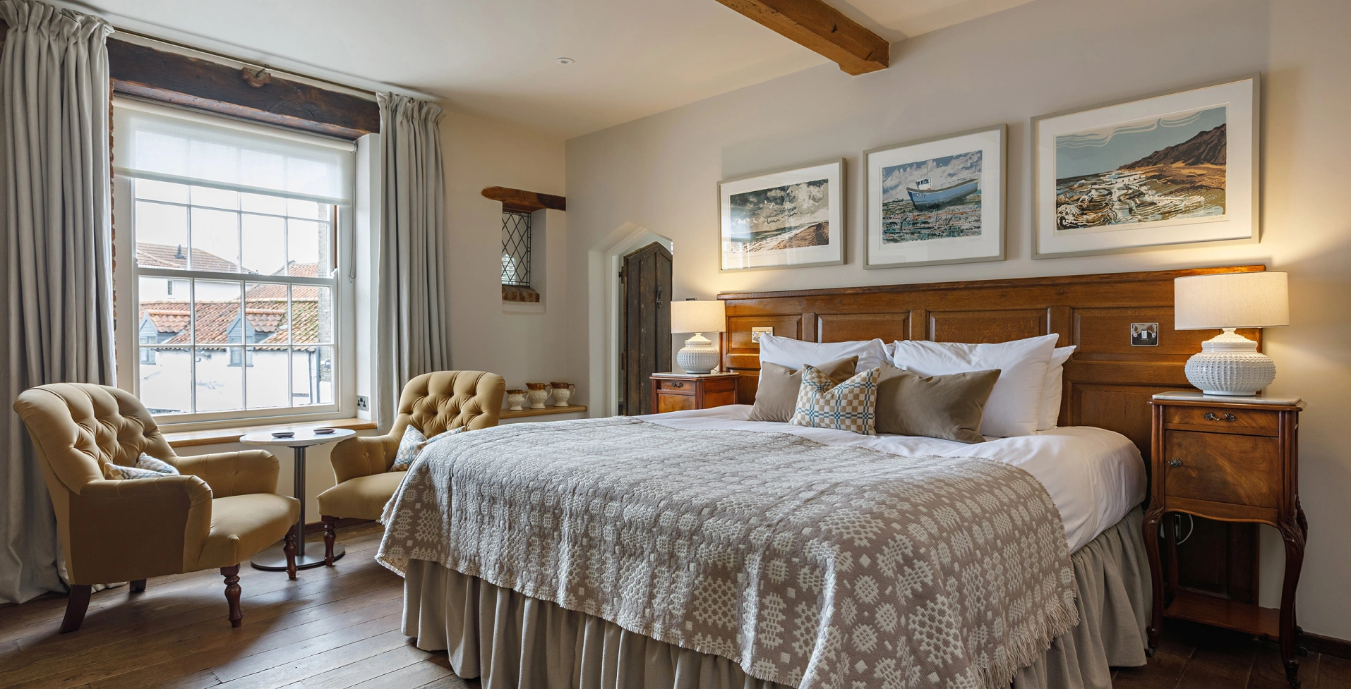 Recently transformed from top to toe, Room 2 combines Byfords’ historic charm with a thoughtful new layout and modern touches. Overlooking Shirehall Plain through a sash window, this front-facing room now features a six-foot bed with a handsome oak headboard, comfy armchairs nestled in the bay window, and a smart desk space. With original beams, exposed brick, and a refurbished bathroom finished in Carrara marble, it’s a perfect blend of comfort and character.