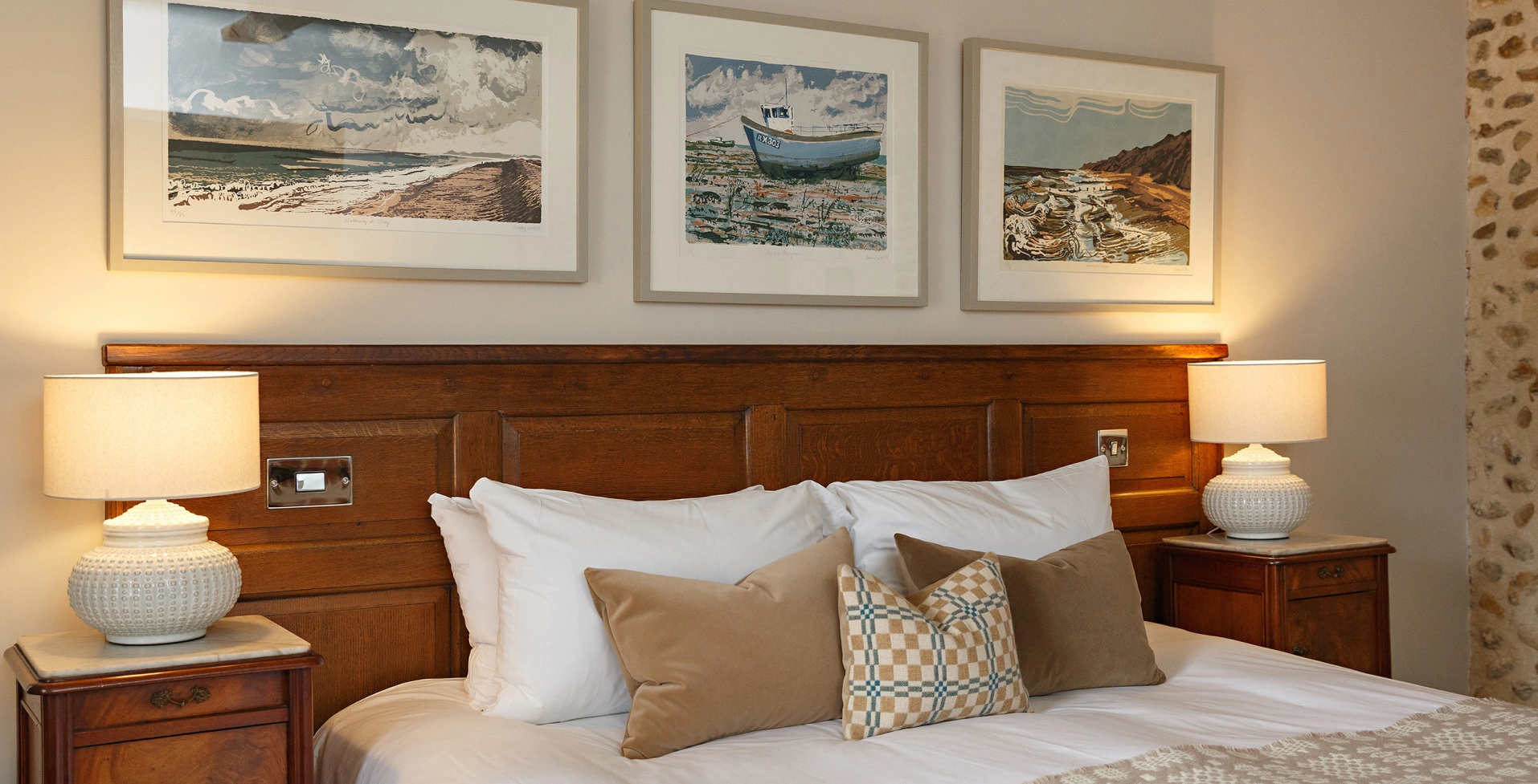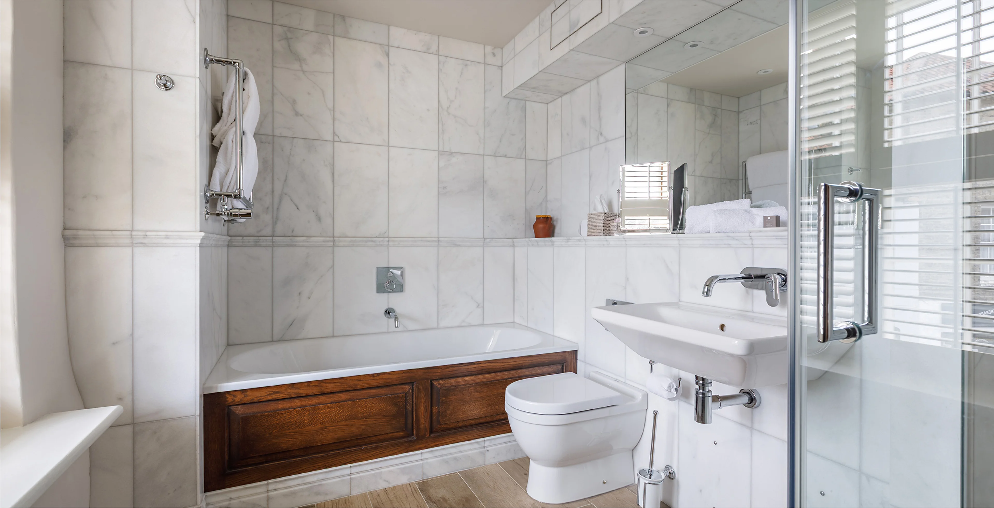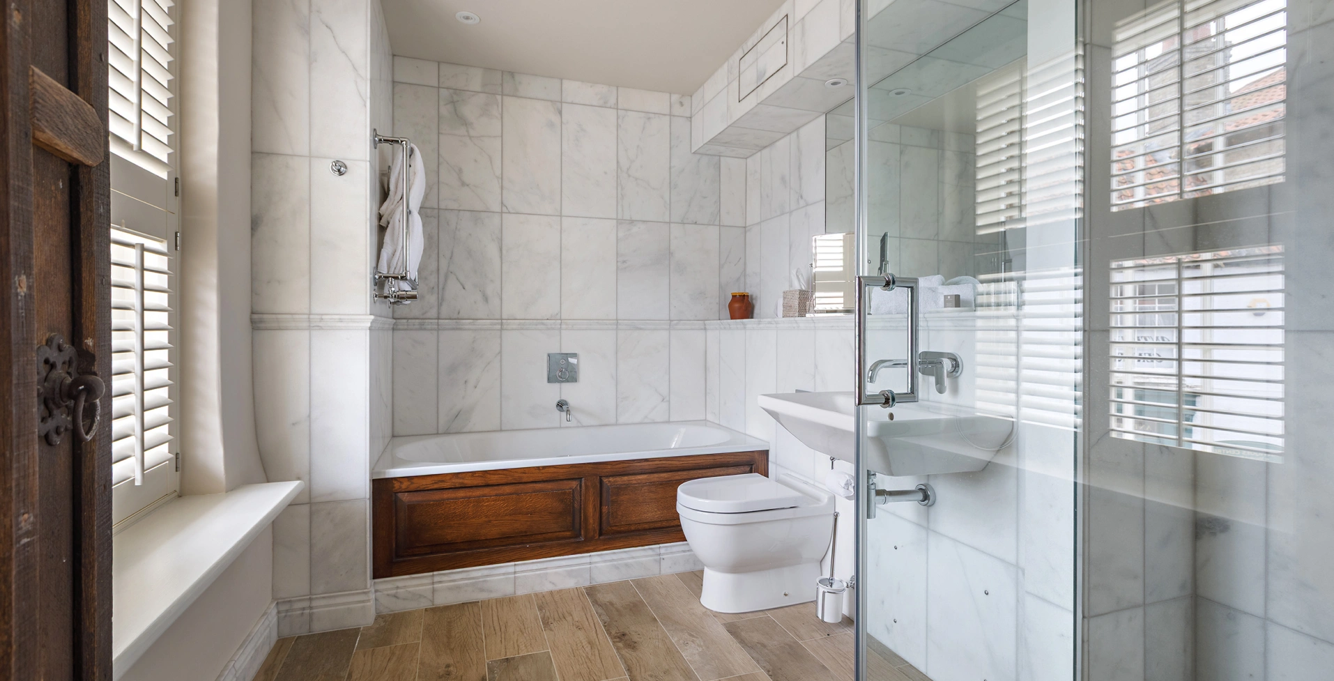 Recently transformed from top to toe, Room 2 combines Byfords’ historic charm with a thoughtful new layout and modern touches. Overlooking Shirehall Plain through a sash window, this front-facing room now features a six-foot bed with a handsome oak headboard, comfy armchairs nestled in the bay window, and a smart desk space. With original beams, exposed brick, and a refurbished bathroom finished in Carrara marble, it’s a perfect blend of comfort and character.
