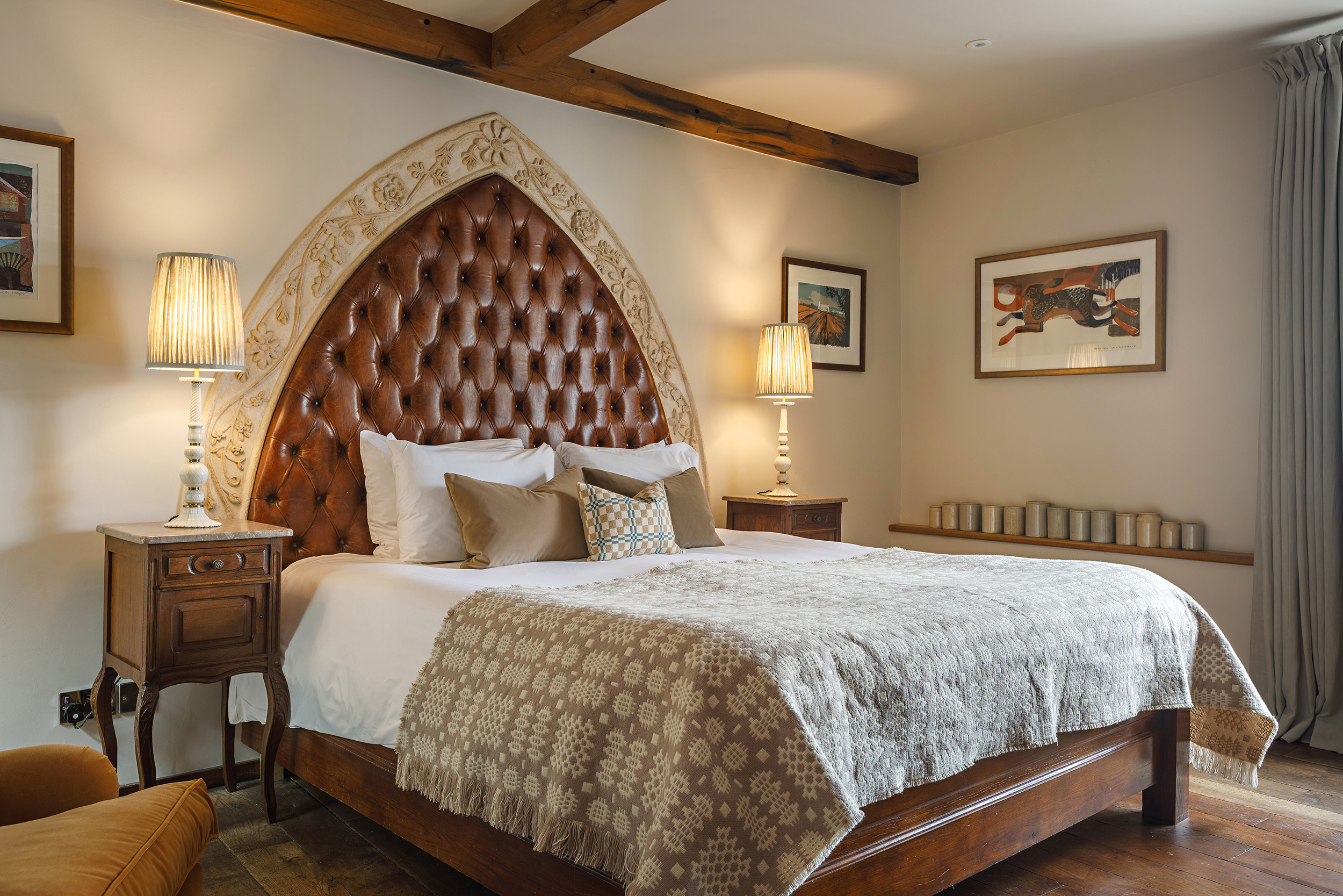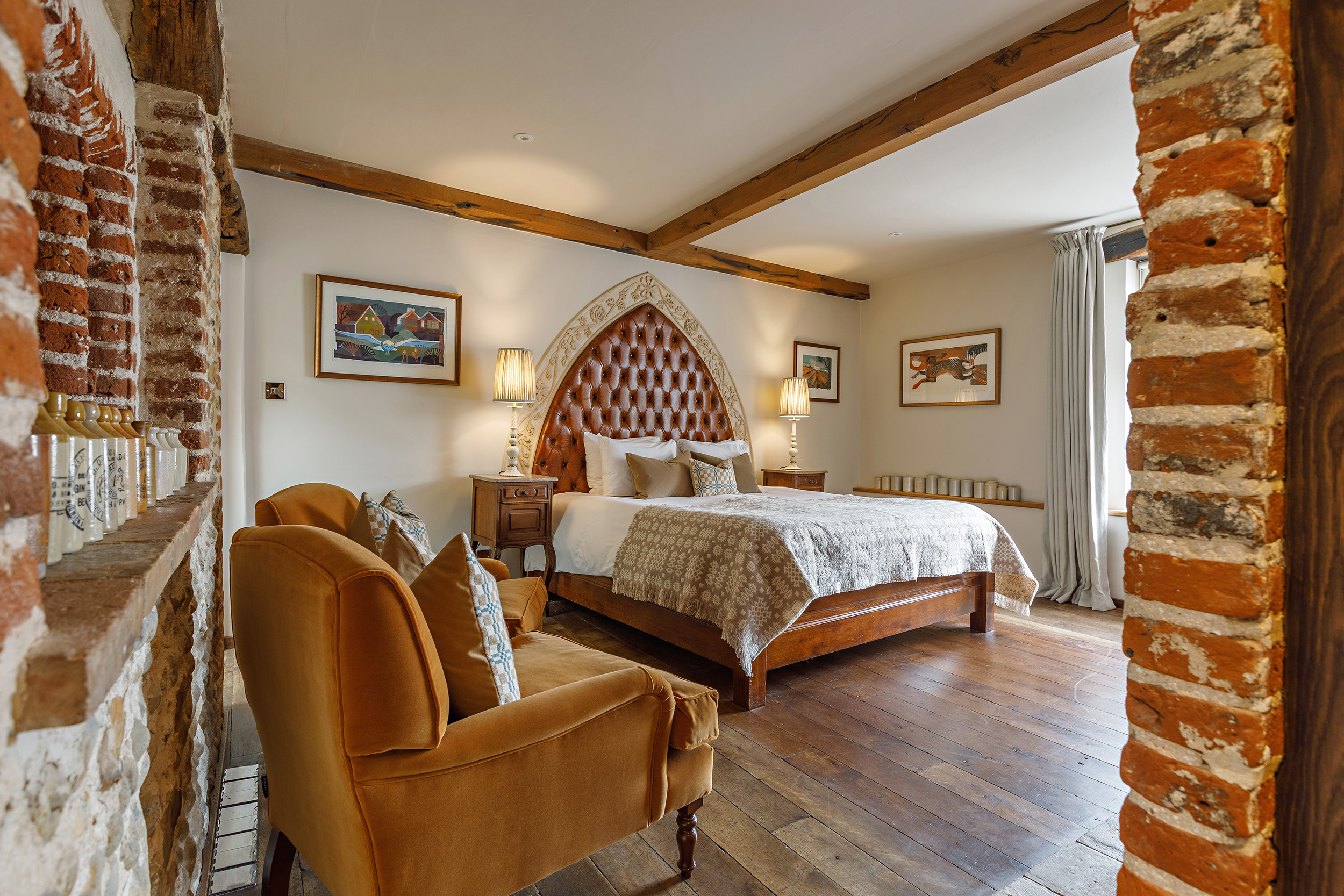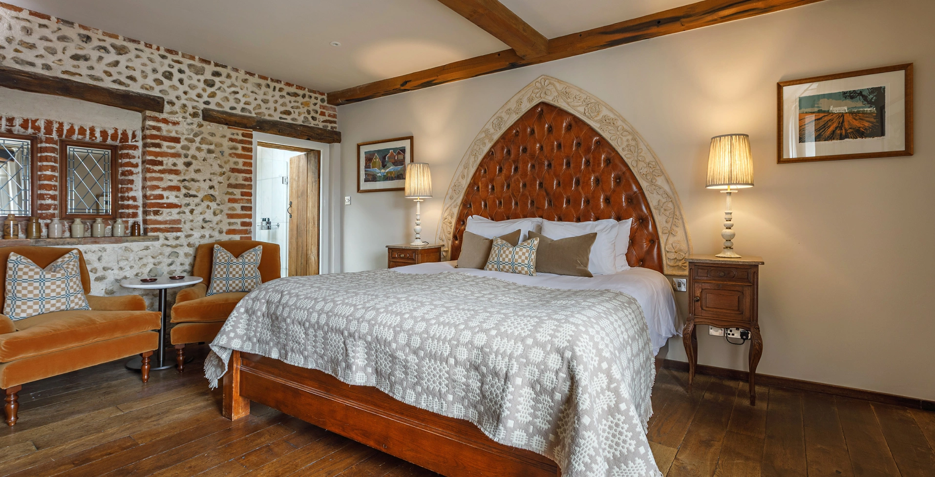 With its sash window overlooking the bustle of Shirehall Plain, Room 3 is a bright and beautifully styled space that mixes timeless materials with modern comfort. Think leather headboard, a separate dressing area, and comfy seating set into the bay window - perfect for slowing down with a cuppa or catching up on a good book. The oak floors and exposed brick give it that signature Byfords character, while a sleek bathroom with Carrara marble and a deep bath invites you to unwind in style.