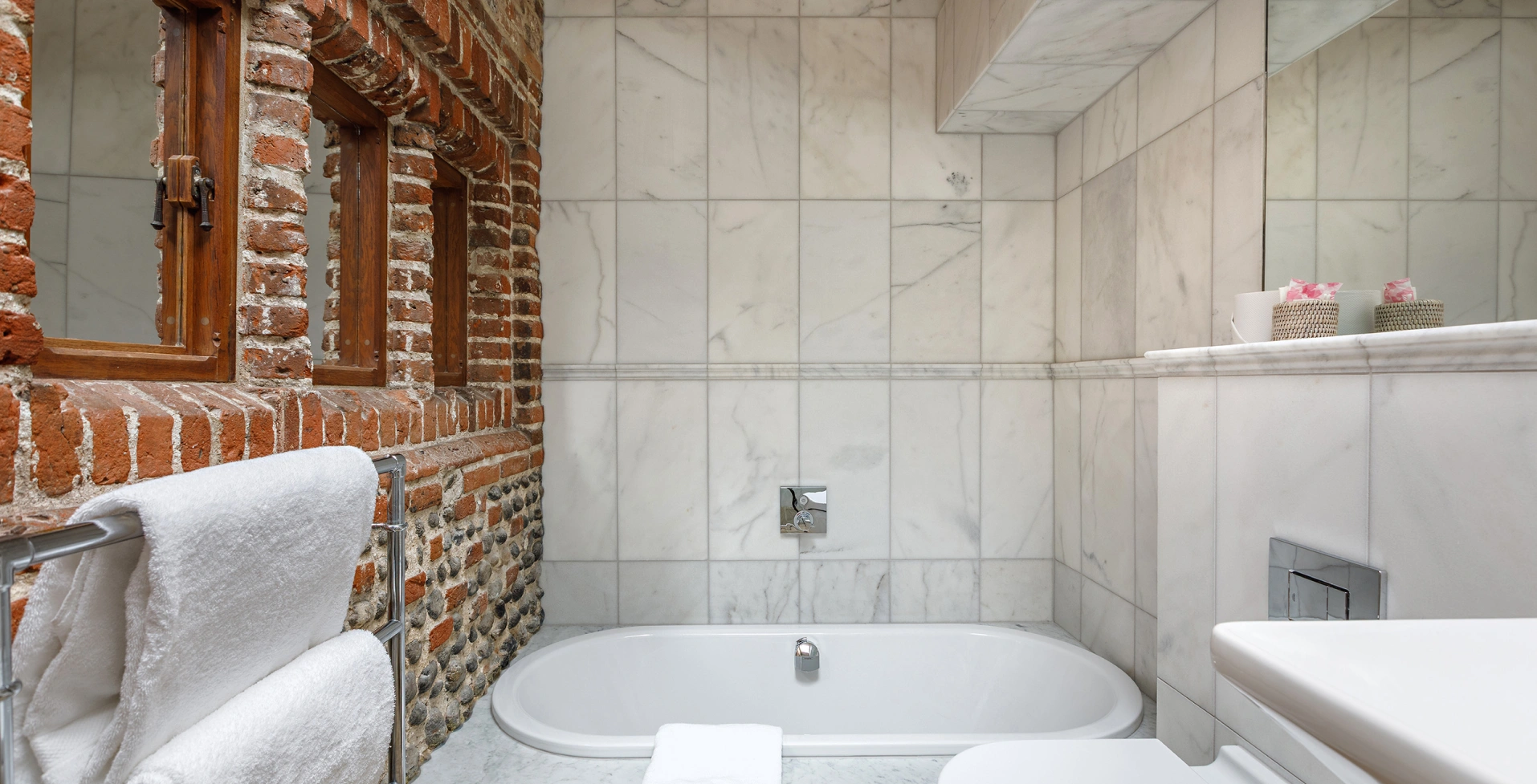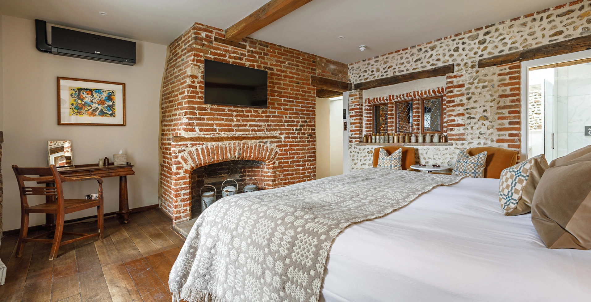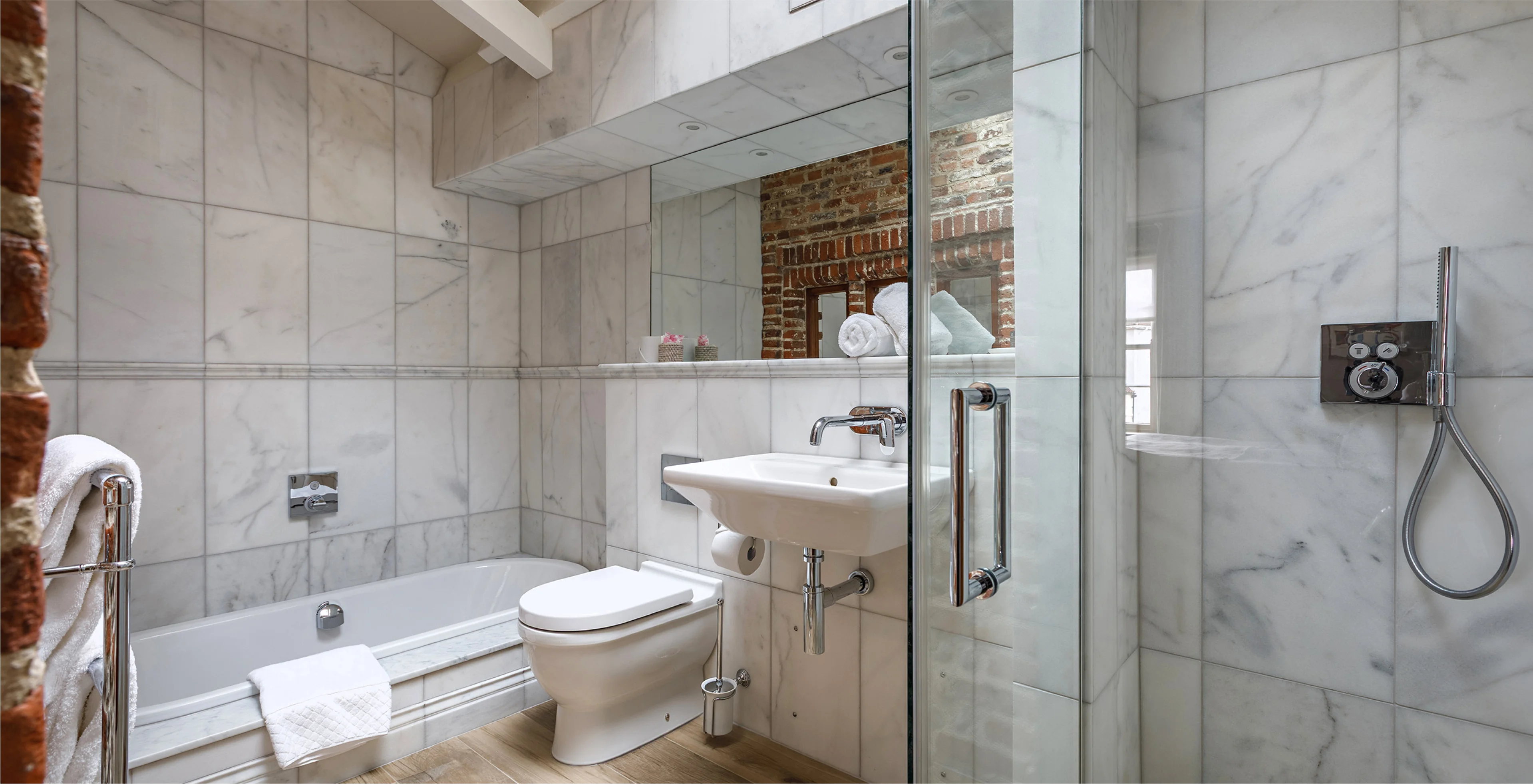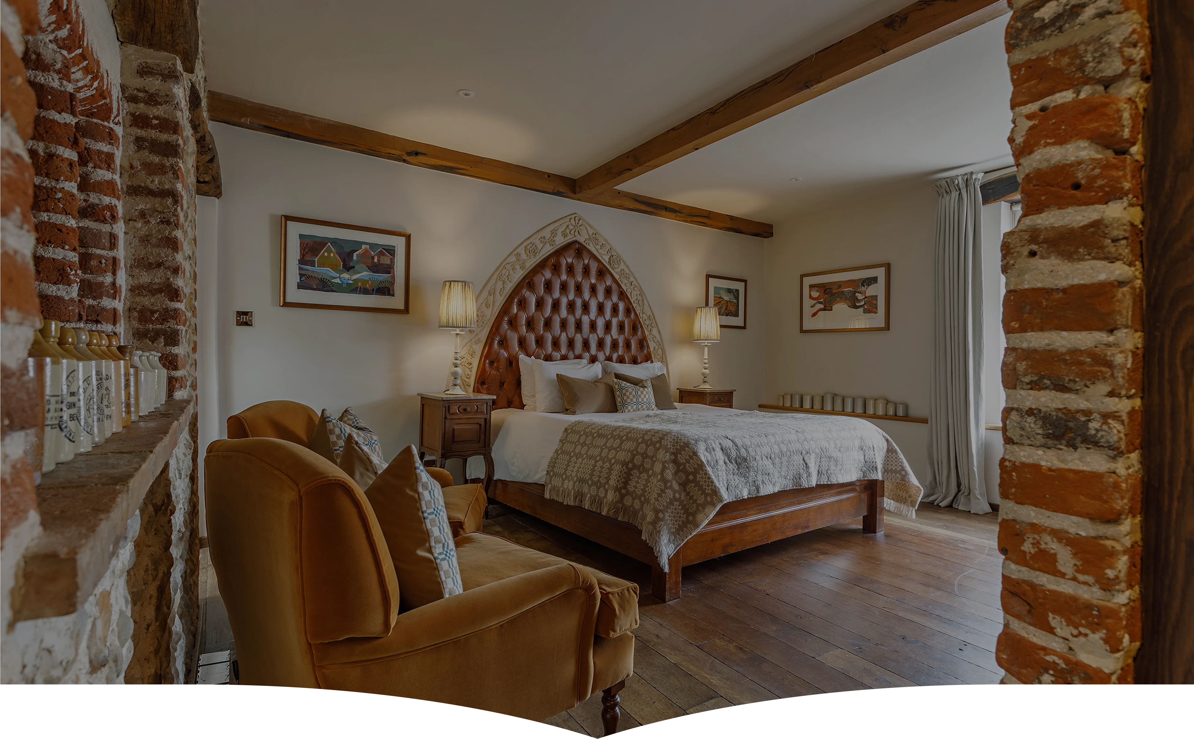 With its sash window overlooking the bustle of Shirehall Plain, Room 3 is a bright and beautifully styled space that mixes timeless materials with modern comfort. Think leather headboard, a separate dressing area, and comfy seating set into the bay window - perfect for slowing down with a cuppa or catching up on a good book. The oak floors and exposed brick give it that signature Byfords character, while a sleek bathroom with Carrara marble and a deep bath invites you to unwind in style.