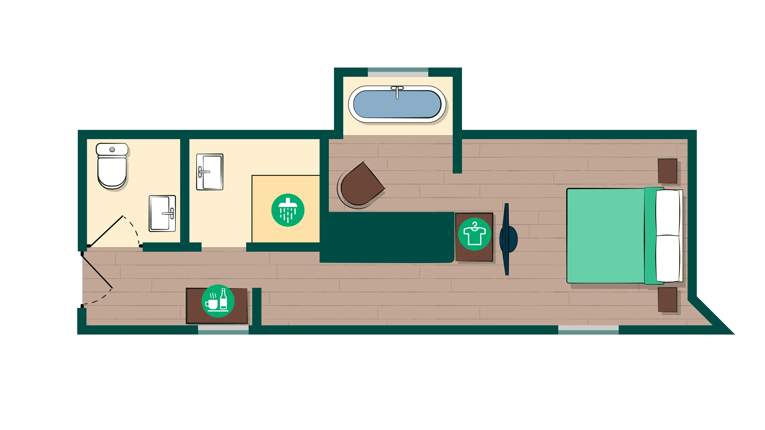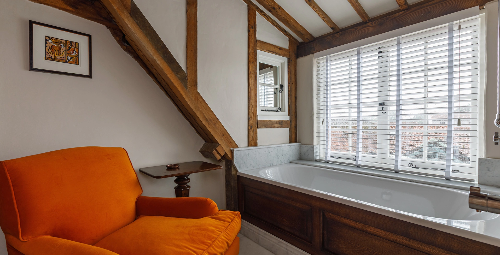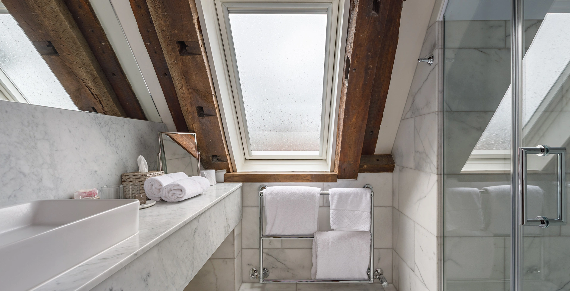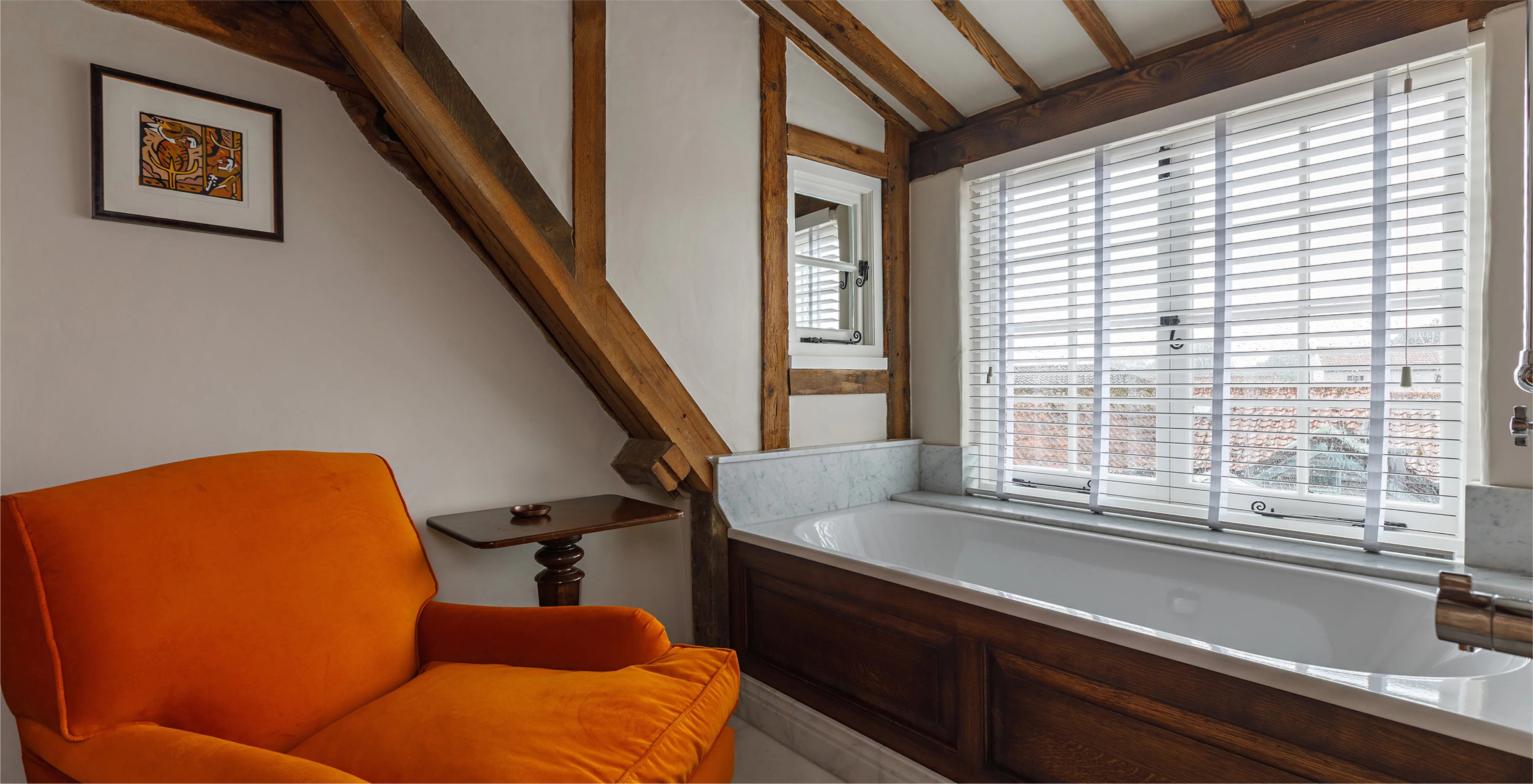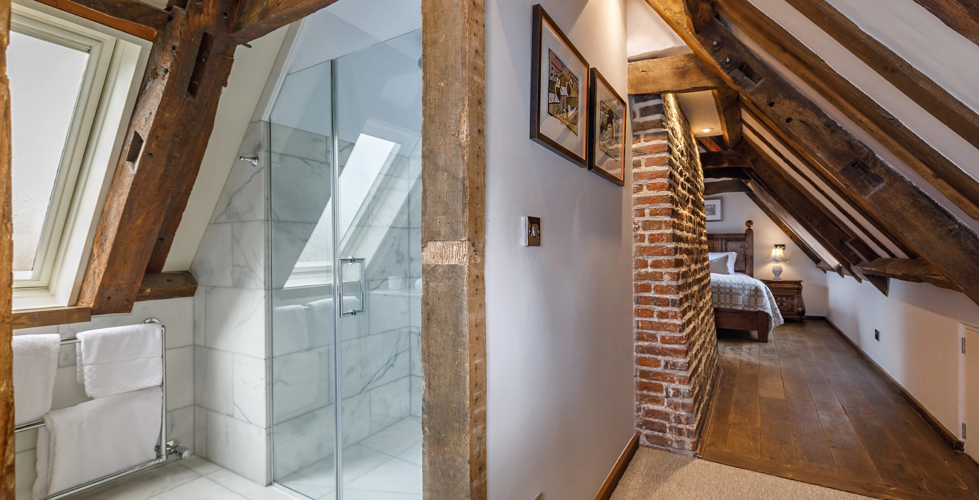 Room 6 has undergone a complete transformation, including a reimagined entrance that allows for a far more expansive and luxurious layout. The result is a spacious top-floor sanctuary, nestled in the eaves and brimming with charm and comfort. A highlight of the redesign is the impressive new bathroom suite, featuring a statement marble-topped bath, along with a separate, beautifully finished shower room. In the bedroom, you’ll find oak floors, exposed brickwork, original beams, and stunning views over Shirehall Plain. It is a true reinvention and one of our most impressive top-floor spaces.