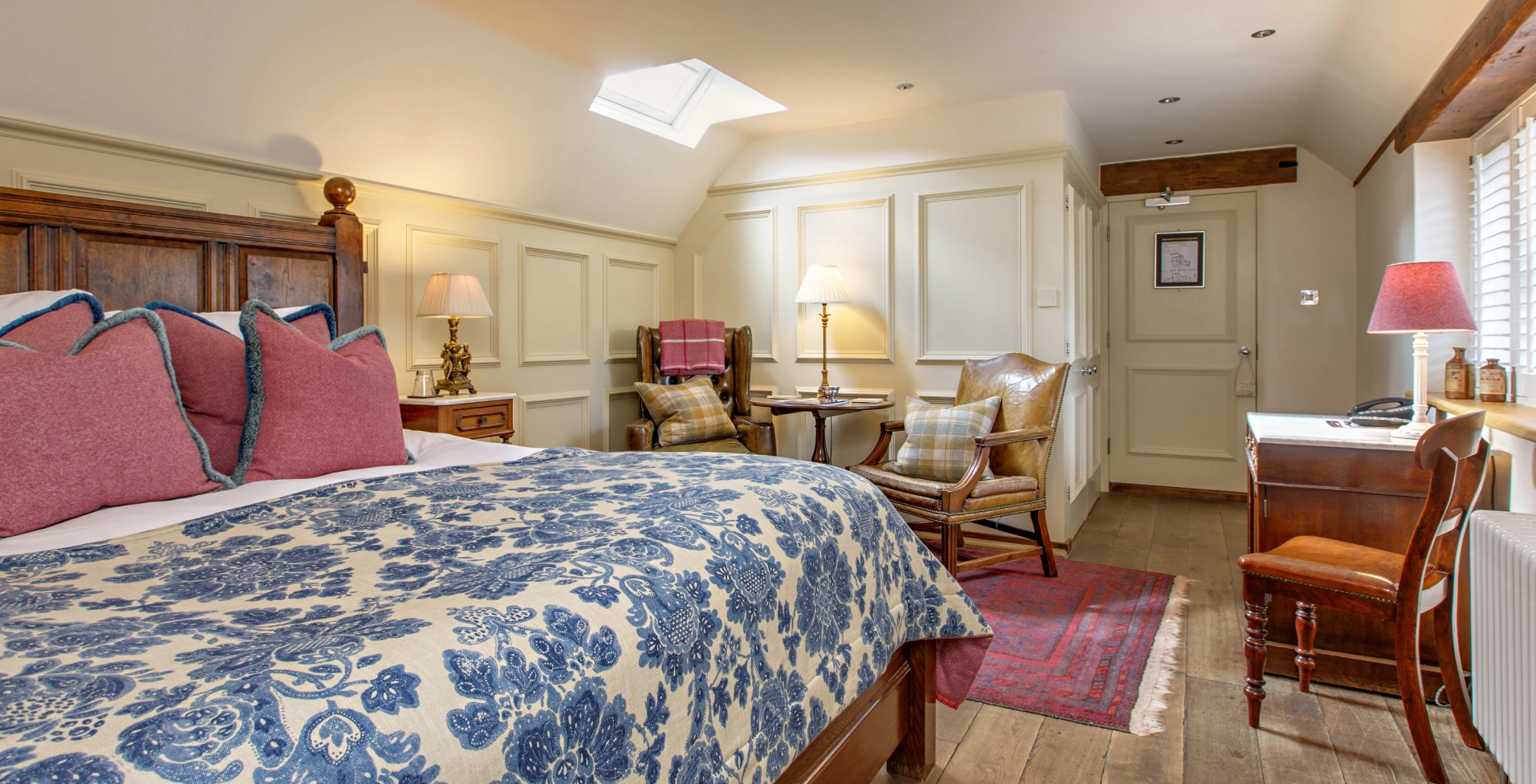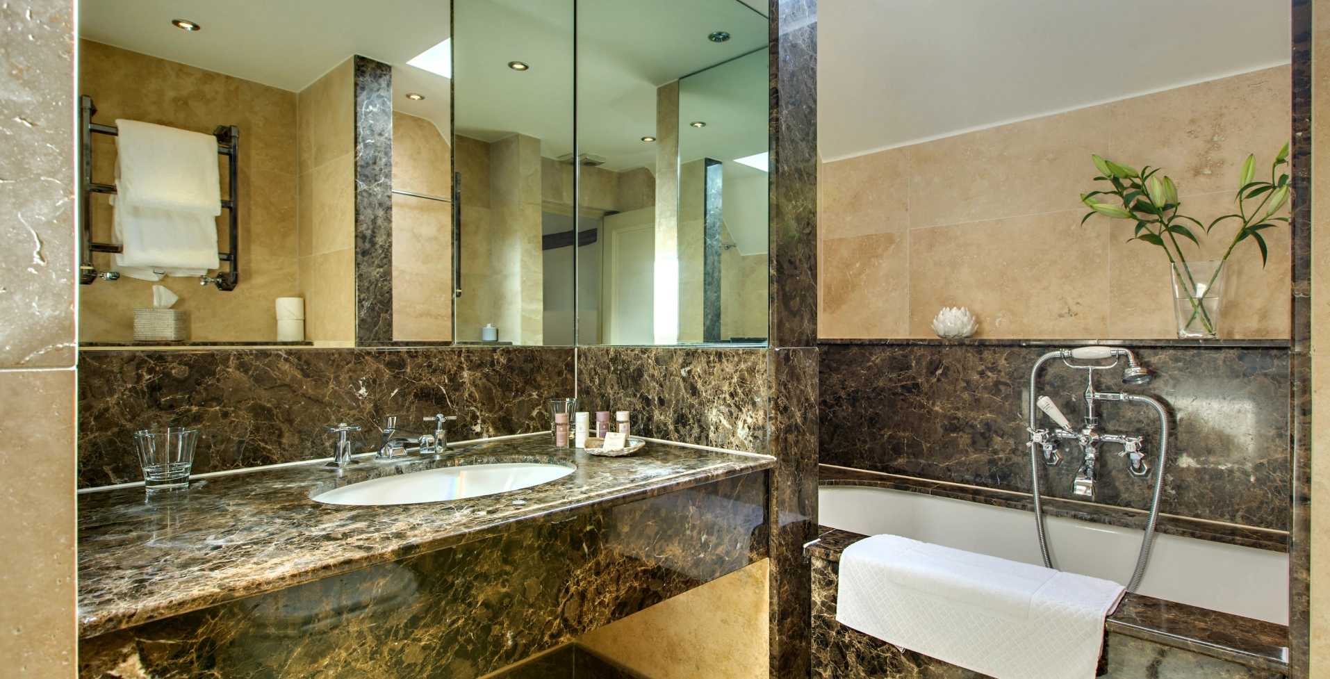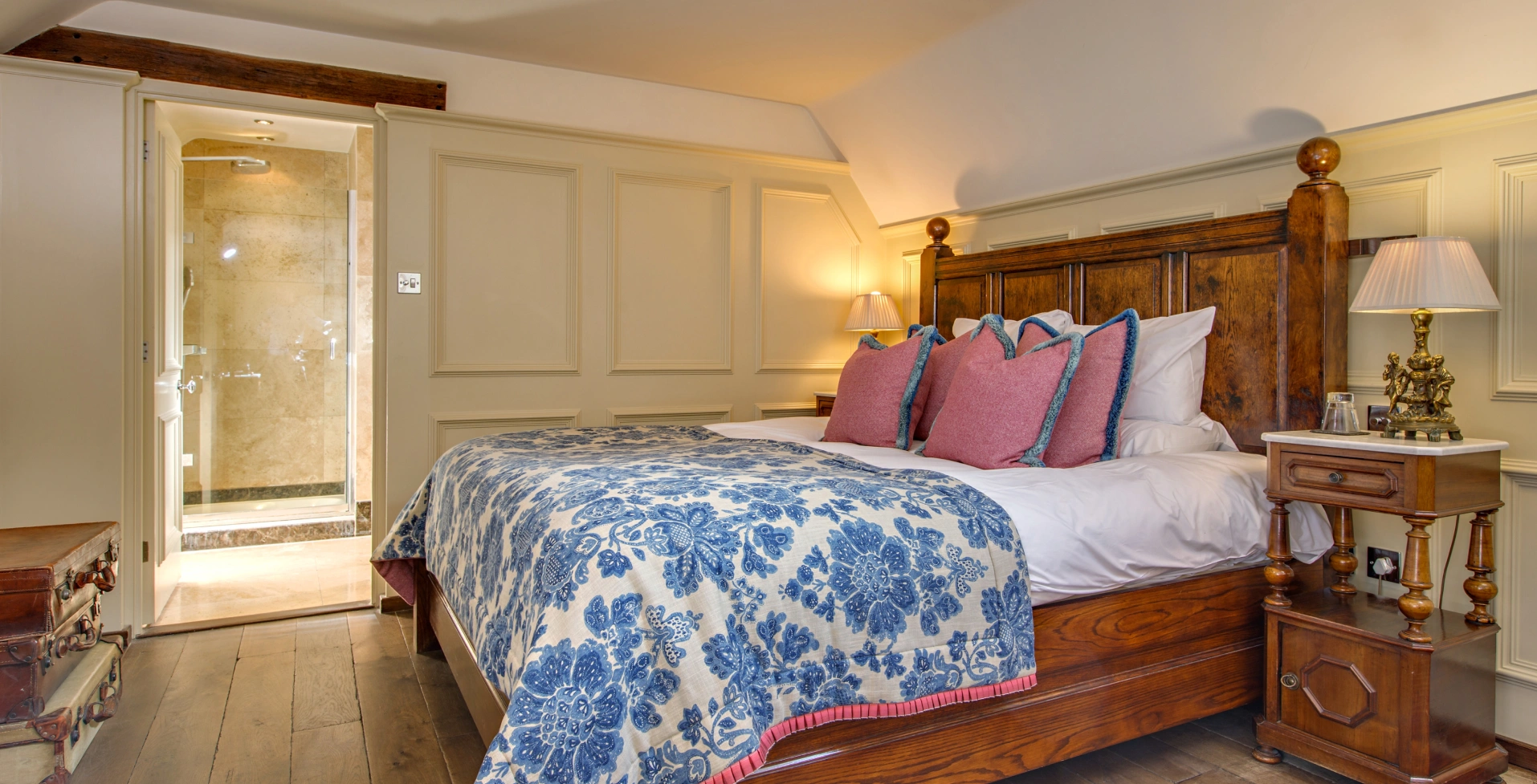 Step into Room 7, a spacious retreat filled with classic Byfords charm. The wood-panelled walls add style and character, and the en-suite bathroom is a standout feature, adorned with striking brown and limestone marble. Take a soak in the dual-bathing tub or refresh under the drench shower, both designed to provide a relaxing spa-like experience.​