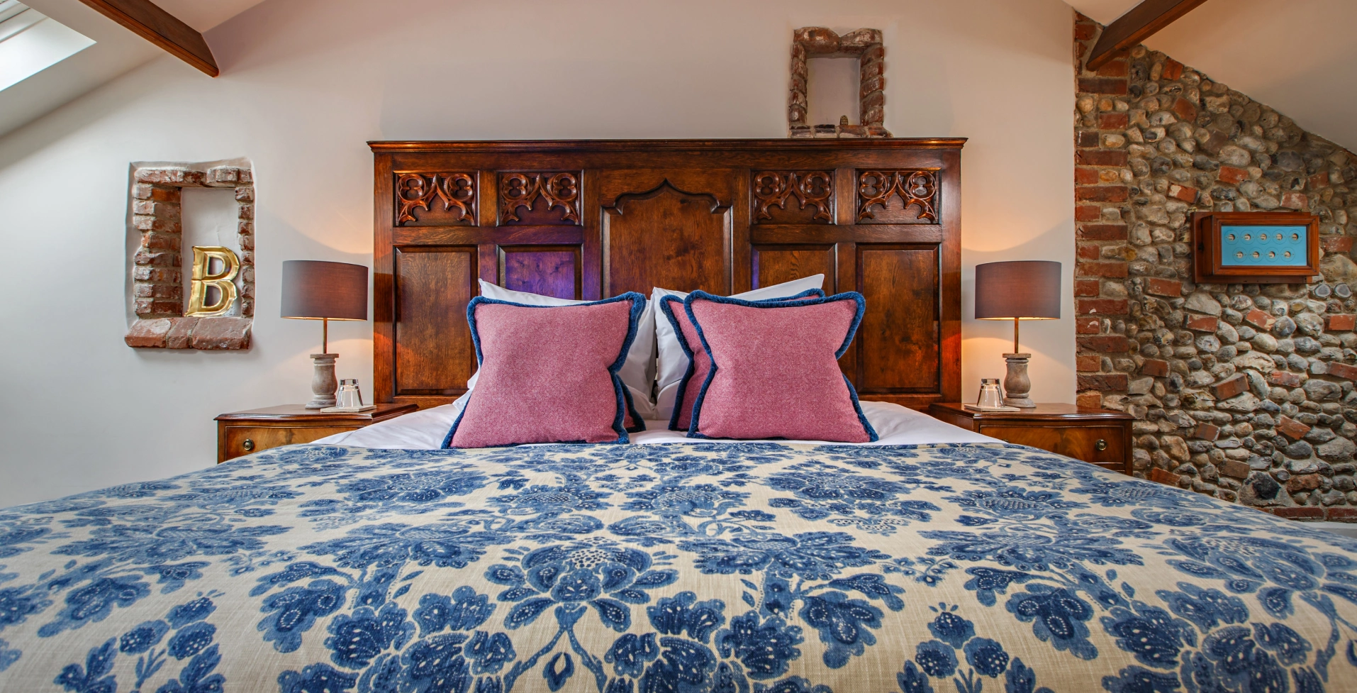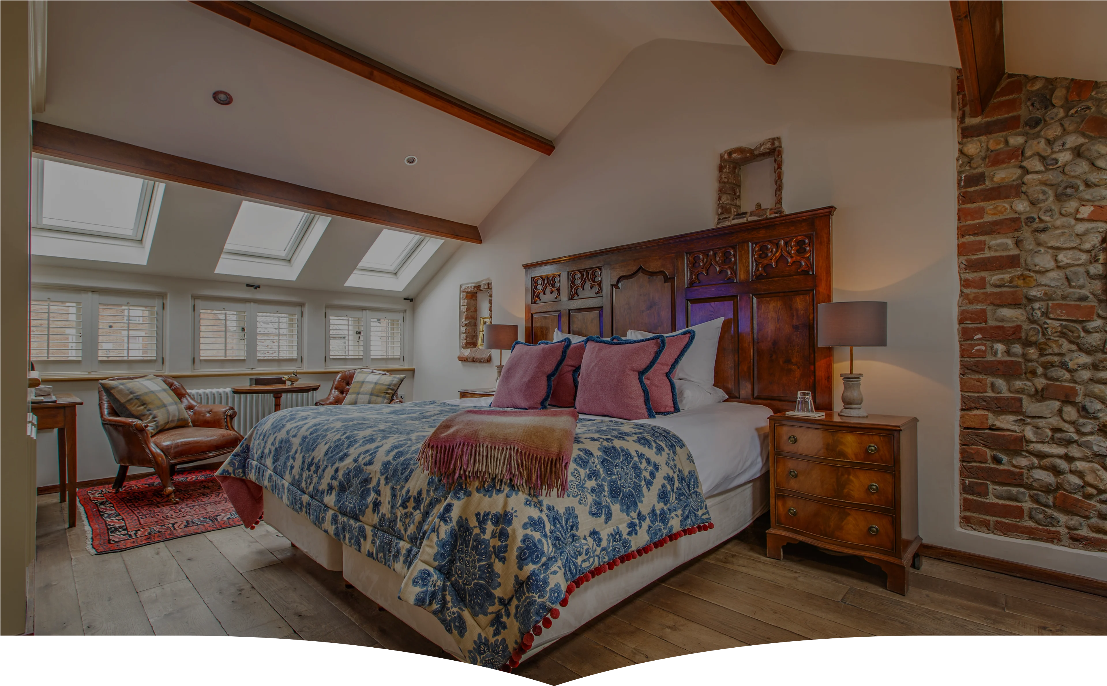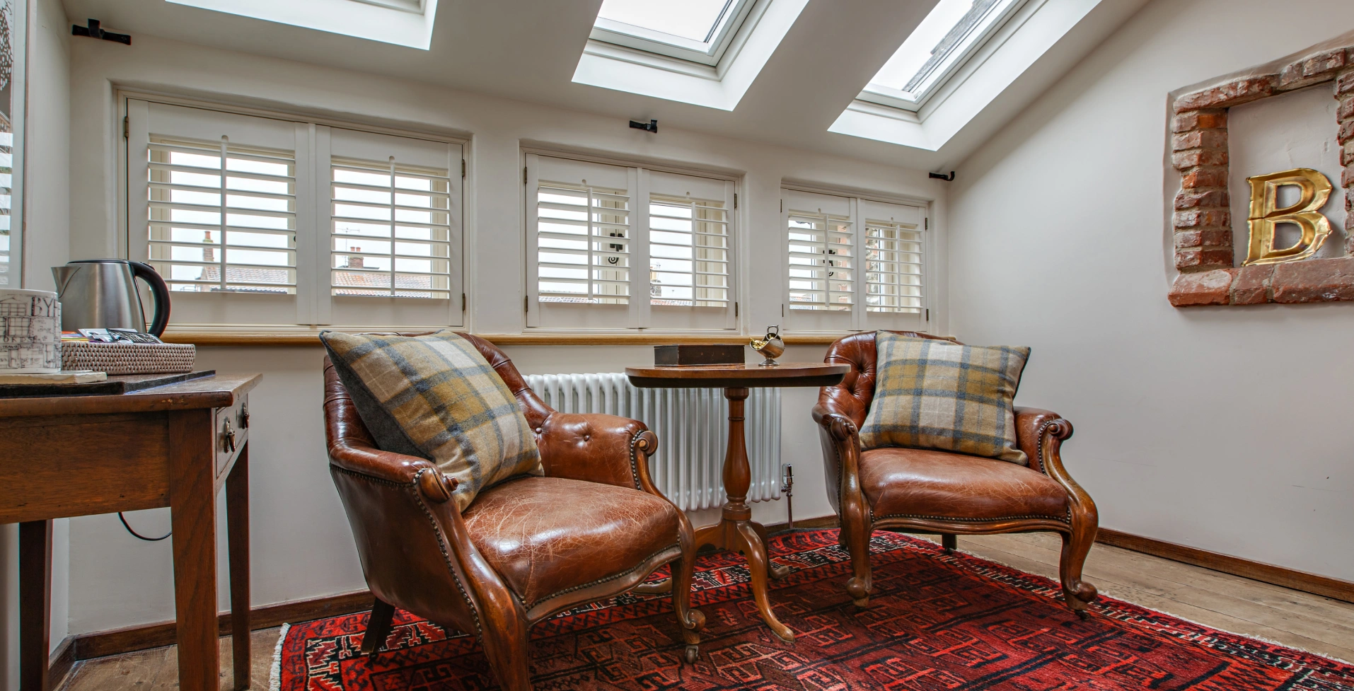 Welcome to Room 9, a beautiful space brimming with character and comfort. Bathed in natural light from its double-aspect windows and high ceilings, it’s one of the brightest spots in the building, perfect for early risers, bookworms, or anyone who enjoys a bit of Norfolk sunshine with their morning cuppa. The en-suite bathroom, adorned with striking brown and limestone marble, adds to the room's unique charm. Whether you prefer a leisurely soak in the dual-bathing tub or a refreshing drench shower, this bathroom caters to your relaxation needs.